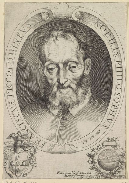 Curator: Immediately, there's a profound sense of depth here; it's far more intricate than just a portrait. The figure seems caught in thought, gazing inwards as if in the midst of some revelation. Editor: We're looking at "Portret van Lambert Lombard," an engraving realized sometime between 1520 and 1567 by Lambertus Suavius during the Northern Renaissance. The linear precision is amazing; Suavius captured every detail! Curator: Yes! Notice the circular composition—a frame almost. The text inscribed within it wraps around Lambert like a halo of identity; you can almost see his spirit swirling. He must have been proud. Or maybe worried that posterity would forget him, hence the engraving? Editor: Interesting take, given how deliberate engraving demands the visual structure. This recalls the geometric aesthetic prominent during that period; even the subject's likeness yields to structured composition. Curator: Structured, yes, but with incredible feeling! See the eyes, the beard. All those lines... the weight of knowing he carries with him. This wasn't some academic exercise; this was capturing a soul. Editor: Perhaps the lines highlight Lombard’s professional identity instead? The text tells us Lombard was a 'Pictor,' associating himself with the traditions of painting through his formal dress and severe features. This also tells us something important about the function of portraiture during the period. Curator: Hmm...or maybe a clever subversion? While nodding to classic forms with the Renaissance flourishes, it seems Suavius really wanted to show us Lambert as an individual first, an artist second. Maybe it was to ensure Lombard was recognised not just for WHAT he painted but who he was, an important distinction often ignored back then. Editor: A charming point. It's captivating to reflect upon this interplay of formal structure versus what is possibly deep-seated longing and purpose that we see flickering still, despite the rigid conventions that frame the image. Curator: Exactly. So much of great art—and, might I add, great artistry in interpreting art—lives right there in those contradictions. It helps keep a fellow creative like myself hungry for insight, you know? Editor: Indeed. Perhaps one needs the boundaries of formalism to truly appreciate art and vice-versa.