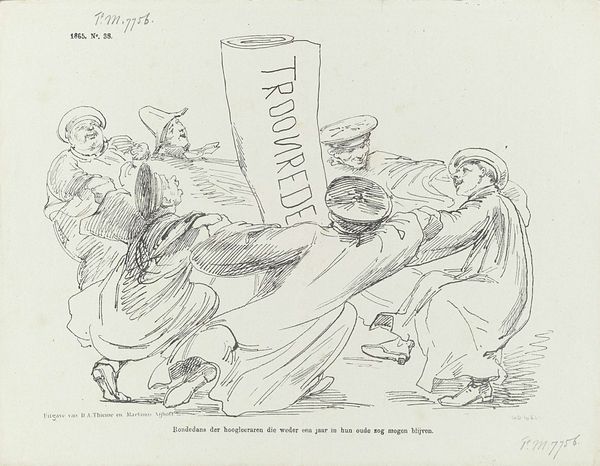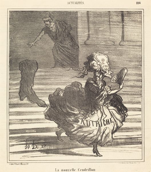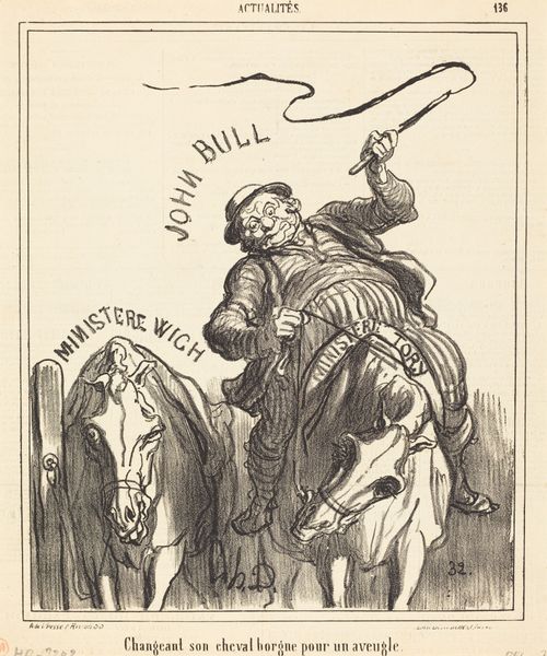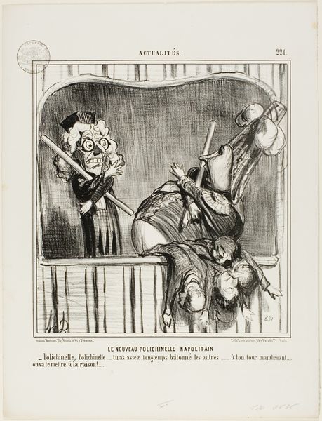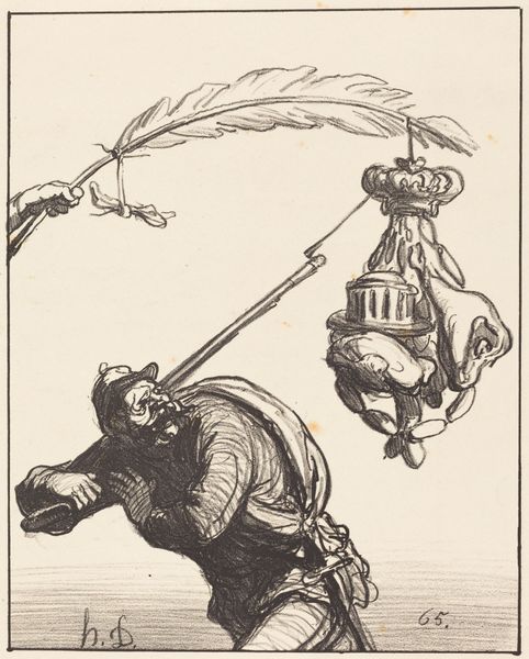 Curator: Honore Daumier’s lithograph, "Gare la lumiere!," dating to 1870, presents us with a complex visual statement on the politics of its time. Editor: The frenetic energy leaps out. These monstrous bird-like figures seem to be attacking this illuminated lantern; their grotesque features disturb and fascinate me. Curator: I would focus on the compositional elements. Notice how the converging lines and shading direct our eye towards the central lamp. The strong chiaroscuro intensifies the drama. Editor: The lantern, which bears the inscription “Liberté Electorale," meaning electoral freedom, serves as the primary symbol, illuminating what appears to be frightened, hostile creatures. The artist uses winged beasts of prey to personify greed and opposition, their outstretched claws aimed toward a distant concept. Curator: I see how Daumier’s use of dark lines creates volume. Observe how it highlights certain features while blurring others to suggest frantic motion, intensifying a moment of chaotic upheaval, not only on the illustrated page but metaphorically also. Editor: Birds have many meanings cross-culturally, sometimes standing in for freedom but also used as omens of dread. The text, "Gare la lumière!" warns to beware of the light. Light, in its symbolical meanings, traditionally stands for hope and truth. Here the implication appears quite grim. This visual strategy serves as the central mechanism by which Daumier engages with this politically tumultuous period. Curator: From my perspective, there's a conscious reduction to primary forms, a flattening of the picture plane typical of lithography. It’s not so much about illusionism as it is about graphic impact and commentary. Editor: Whether through intentional mark making or potent iconography, "Gare la lumiere!" is an active warning. Even now it conveys that hope is a dangerous thing. Curator: Its formal structure, viewed within the tradition of caricature, pushes realism into social critique. The technical mastery is hard to dismiss, isn’t it? Editor: Yes, and what stays with me is how those historical fears and societal critiques remain strikingly relevant today.