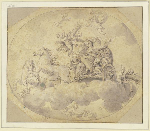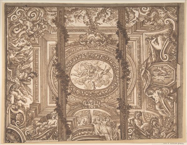 This is Marco Angolo del Moro’s Design for a Ceiling, drawn sometime in the 16th century with pen and brown ink. Del Moro was working in a time and place--Renaissance Italy--where there was great interest in antiquity. Here, Del Moro imagines Aurora, the Roman goddess of dawn, riding her chariot across the sky. The goddess and her cherubic companions are framed by intricate ornamentation which speaks to the period’s artistic and cultural values. This was a time when the aristocracy used art to fashion themselves as enlightened rulers, with mythological references serving as metaphors for power, wealth, and divine right. The drawing provides an intimate glimpse into the aesthetic values of the Italian elite. While we can appreciate the technical skill and artistry on display, it's important to remember the social and political functions this type of art served, and what it meant for those excluded from its narratives.