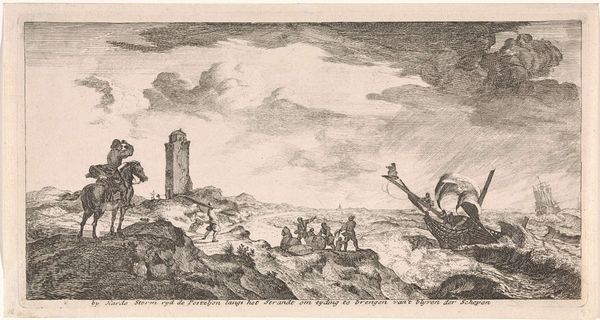 Curator: This is Jacques Callot's "Naval Combat," held here at the Harvard Art Museums. It depicts a rather chaotic scene, doesn't it? Editor: It does! My first thought is how the stark contrasts create this wonderfully tense atmosphere. You can almost smell the gunpowder. Curator: Indeed, Callot's mastery of etching is evident in the meticulous detail. Note the contrasting textures—the smooth sky against the rough rocks. Editor: The rocks really dominate the foreground. They're like silent witnesses, or maybe even participants, looming over the skirmish. Curator: One could argue that Callot uses the landscape to symbolize the immutable forces at play during conflict. The human drama seems almost dwarfed. Editor: It’s interesting how he balances the intimate and the epic. I mean, you feel the intensity of the battle, yet it's all framed within this grand, almost indifferent, setting. It’s like a stage, really. Curator: Precisely. Callot orchestrates a powerful visual discourse on conflict, its stage, and its players. Editor: It leaves you pondering the futility and grandeur of it all, doesn't it? I see something new each time.