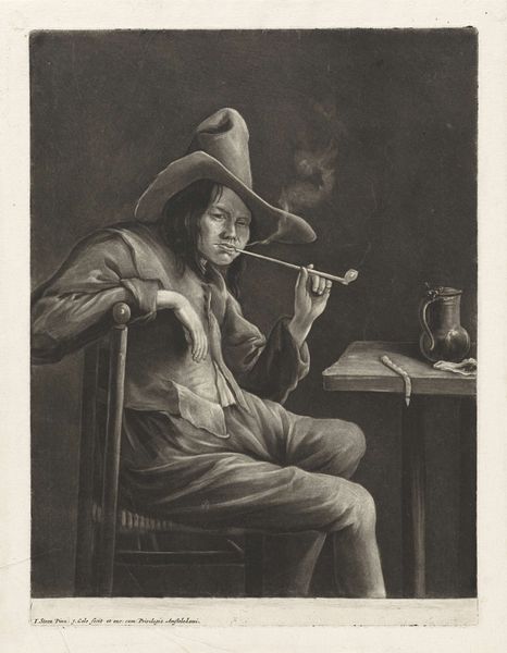 Editor: We're looking at "The Face: Man with an Empty Jug," an engraving by Jacob Gole, dating from between 1670 and 1724. The figure looks quite despondent, slumped over as he pours the last drops from the jug. What do you see in this piece beyond the immediate subject? Curator: This image presents a powerful critique of societal issues masked by genre scenes. Look at the man's worn clothing and posture. Does that suggest simple joviality or something more dire? In 17th-century Dutch art, genre scenes often served as veiled commentaries. How does this figure, possibly representing the working class, confront realities of poverty, perhaps addiction, under the guise of everyday life? Editor: So, you're saying that the 'emptiness' extends beyond just the jug? Curator: Precisely! Consider how societal structures enable and perpetuate conditions that lead to this man's state. The Dutch Golden Age wasn't golden for everyone. There were deep class divisions, exploitation. Gole prompts us to reflect on the ethics of profiting from the labor that leaves so many, like him, in material and spiritual poverty. Does the focus on individual failing detract from, or reinforce, our focus on larger systems? Editor: It's like he's not just an individual but a representation of broader societal issues. This invites me to consider how representations of labor and class intersect with prevailing socio-economic norms and power structures. Curator: Exactly! This image captures a moment of vulnerability, reflecting the personal consequences of widespread inequality and systemic injustice. I wonder what solutions this image inspires within us? Editor: I hadn't considered it in this way before. Thanks to your insights, I appreciate how Gole's work is rooted in specific issues related to class struggles during the Dutch Golden Age. Curator: Indeed. These seemingly simple drawings become tools to engage in discussions about ethics, visibility, and collective action.