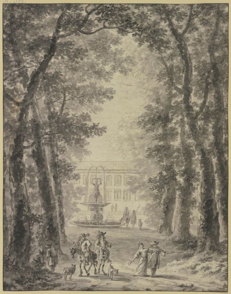 Editor: So, this is "The Park at Saint-Cloud" by Louis-Gabriel Moreau. It's a watercolor, quite small. It feels almost like a stage set with those figures posed against the architecture. What do you see in this piece? Curator: The park itself is a symbol. The figures, dwarfed by the scale, remind us of our fleeting presence. The statues, are they Apollo and Diana, or idealized royalty? They represent order, control, a yearning for a golden age, but also a vulnerability to time. Does the image evoke a sense of loss or possibility for you? Editor: I hadn't thought about the statues as symbols of order...more like decoration. I see the people as enjoying themselves, or trying to. Curator: And perhaps that is the most powerful symbol of all, our individual and collective need to find joy and connection within these constructed spaces. Editor: That is an interesting perspective; I hadn't considered the symbolism of constructed spaces and the need for connection.