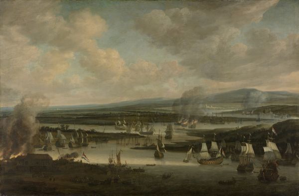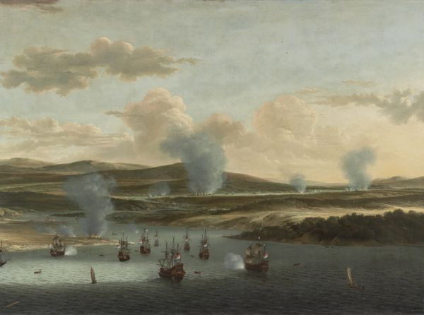 Curator: Hendrick van Anthonissen created this compelling painting, now known as "A Dutch Squadron under the Command of Cornelis Simonsz van der Veer Carrying Out a Surprise Attack on Three Portuguese Galleons in the Bay of Goa Velha, 30 September 1639," sometime around 1653. Editor: It’s quite a dramatic scene! The way the light catches the smoke from the cannons creates such a tense, almost oppressive atmosphere. Curator: Absolutely. It depicts a significant naval engagement within the context of the Dutch-Portuguese War. Anthonissen wasn’t simply creating a landscape; he was capturing a moment of Dutch imperial expansion and military dominance. It speaks volumes about the rising power of the Dutch Republic and its challenge to Portuguese control in global trade routes. Editor: What strikes me, too, is how the artist utilizes the horizon line and atmospheric perspective. The detail diminishes further back in the composition, almost as if blurring with the heavy smoke clouds that surround the ships. The color palette, predominantly earth tones, emphasizes this intensity. Curator: I agree. We can't ignore the symbolic importance of the flags so prominently displayed on the Dutch ships, asserting a claim of dominance in this very visible territory. The painting was created not just to document an event but to legitimize and celebrate Dutch actions on a global stage. Editor: The ships are incredibly detailed; you can almost feel the texture of the wood and the ropes. He contrasts this acute realism with an almost dreamlike handling of the water and the coastal mountains, giving us this dynamic but subtly unsettling effect. It evokes power and danger but also, somewhat, reflects the Dutch skill in sailing the high seas. Curator: This artwork gives us a unique entry point for understanding the confluence of military action, art, and politics in the 17th century. We see, quite literally, how the Dutch constructed a narrative of their colonial ventures for the homeland. Editor: A final thought then, I think the artistic skill is as apparent as its propaganda intent, as Van Anthonissen melds meticulous detailing and nuanced light effects that leaves me intrigued to learn even more about this decisive maritime combat.