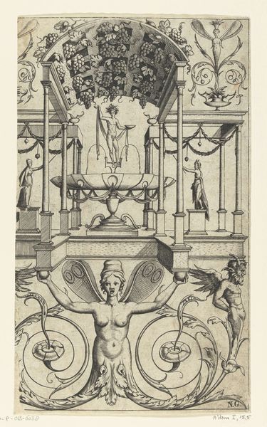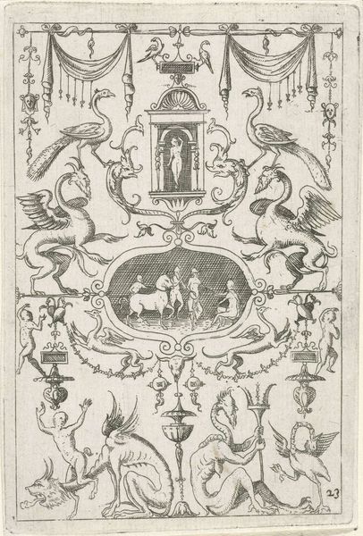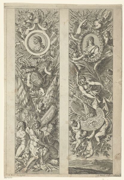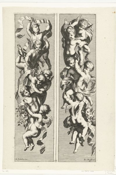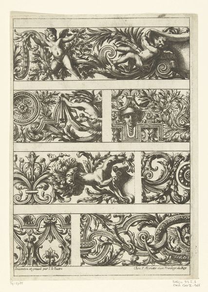 Editor: This is “Vier rijen friezen,” or “Four Rows of Friezes,” a drawing and engraving by Jean Lepautre dating from before 1716. It’s currently held at the Rijksmuseum. What strikes me are the playful figures interspersed with rather severe geometric forms. How do you interpret this work, looking at the way Lepautre combined those elements? Curator: It's a fascinating dance between classical order and Baroque exuberance, isn’t it? Consider the frieze itself, a form steeped in classical history, meant to convey power, stability, and narratives through repeated symbolic elements. Now look at Lepautre’s additions. Editor: The cherubs, right? They almost seem to disrupt the rigidity. Curator: Precisely. These aren't just decorative elements, they’re potent symbols of love, innocence, and divine presence, often used to humanize and soften otherwise stern architectural spaces. Lepautre's choice to include them in various states of activity – reclining, reaching, and bearing garlands – adds an element of dynamism. Notice also the masks. Do they evoke a specific feeling to you? Editor: Maybe a sense of theatricality? Something performative? Curator: Indeed! Masks, particularly in the Baroque period, symbolized transformation, deception, and the duality of human nature. Their inclusion suggests that even within the confines of established order, there is room for illusion, play, and perhaps a touch of subversion. These aren't merely decorative details; they engage the viewer in a complex visual game, reflecting the shifting cultural landscape of the era. Editor: It’s amazing how much symbolic weight each element carries. I see it so differently now. Curator: And that's the beauty of art; its power to continually reveal new layers of meaning across time.