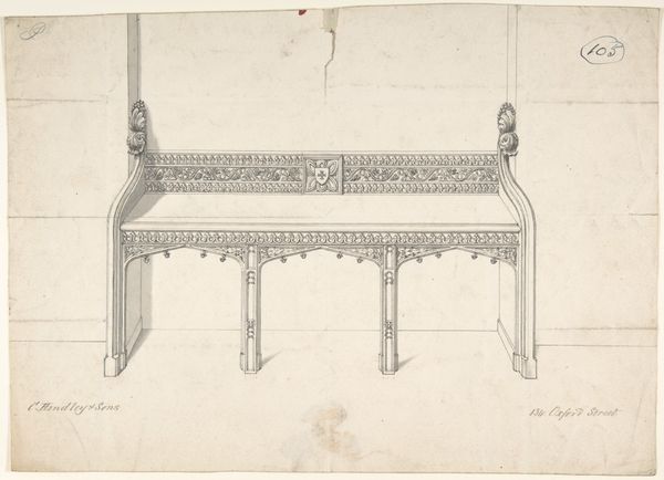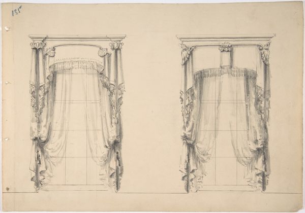 This delicate drawing was produced by Charles Hindley and Sons, likely in the late 19th century. It is rendered in graphite on paper, showing a partial design for a bay window, complete with elaborate, monogrammed curtains. The choice of graphite, a relatively humble material, allows for intricate detailing and subtle shading, essential for conveying the texture and depth of the proposed design. You see how the crisp lines define the architectural elements, while softer strokes suggest the drape and fall of the curtains. The design shows a highly ornamented interior, indicative of the Victorian era’s ethos of excess. The monogrammed curtains speak to the personalization of domestic space, a potent symbol of status. Consider the labor involved. From the textile production of the curtain fabric, to the highly skilled needlework required for the monogram, to the craftsmanship needed to produce the complex window structure. This drawing offers a glimpse into the aesthetics of wealth, but also the labor required to create it. Appreciating such designs means acknowledging the social context of their making, and use.