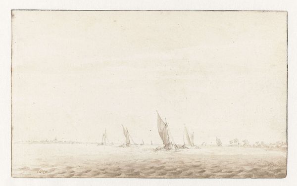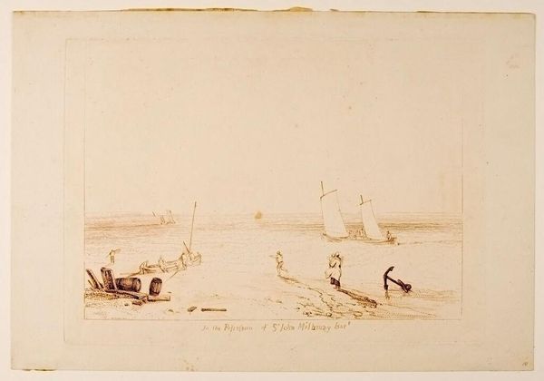 Editor: This sketch, “Figures on the Beach,” done in the style of Turner, uses chalk and graphite on paper. It’s so delicate. I’m curious about the artist's choices in materials. What do you see in this piece? Curator: I notice the interplay between labor and leisure. The boats represent labor, a means of production, while the figures suggest leisurely consumption of the beach. Consider the accessibility of these materials—chalk, graphite, paper—and their role in democratizing art-making. How does that affect our understanding of the scene? Editor: That’s a great point. It does make the scene more relatable, less idealized. Curator: Exactly. It’s a beach for everyone, rendered with readily available materials. Editor: I'll definitely think more about how artists' material choices impact the social context of their work.