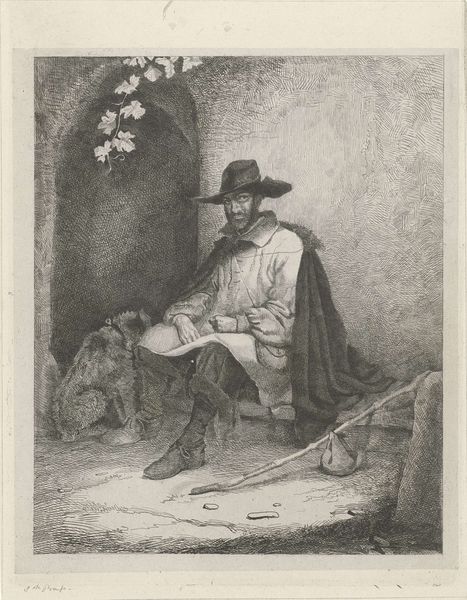 Joel Ballin’s “Læsende Abate,” offers us a study in monochrome elegance rendered through engraving. The composition, dominated by the vertical lines of the window and the figure, draws the eye into a quiet, contemplative space. The grey tones create a muted atmosphere, emphasizing the texture of the walls and the soft light filtering through the window. The structural arrangement, with the figure leaning against the bed, introduces a dynamic tension between the vertical and horizontal planes. Note how the stark geometry of the room contrasts with the soft curves of the landscape visible through the window. This interplay of forms suggests a dialogue between the internal world of the reader and the external world of nature, each framing and informing the other. The semiotic weight of the cross on the wall, positioned directly above the bed, provides a symbolic counterpoint to the open window, hinting at themes of faith, confinement, and the desire for transcendence. The image invites us to consider the complex interplay of signs and forms, each contributing to a larger narrative of intellectual and spiritual introspection.