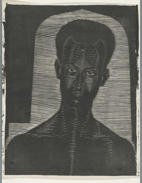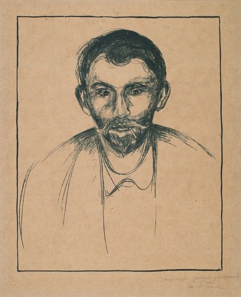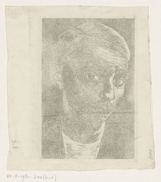 Editor: We're looking at Jan Mankes' "Self-portrait with mustache," an etching from 1915. There’s something quite vulnerable about it, despite the mustache which attempts a kind of…defiance? What do you see in this piece, especially considering the period? Curator: What strikes me immediately is the act of self-representation itself. In 1915, as Europe was being torn apart by war, Mankes turns inward. This etching becomes a quiet, intensely personal act of resistance against the machismo and nationalistic fervor of the time. Do you notice how the detail given to the face contrasts with the understated clothing? Editor: Yes, the face feels so present, almost hyper-realistic in its detail. While the body fades into the background, de-emphasized. Curator: Exactly. Mankes seems to be asking, "What does it mean to be a man, an artist, in a world consumed by violence?" He challenges prevailing notions of masculinity not through grand gestures, but through quiet introspection. This work makes visible the often-erased perspectives of those who questioned dominant narratives of the time. Who were seen but unheard. How does it speak to you now? Editor: I never considered it in that light. Seeing it as a deliberate act of introspection rather than just a self-portrait really changes how I read the image. I feel it on a personal level. The contrast between the time of violence and introspective gaze adds to my appreciation of the work. Curator: Right. So considering Mankes’s gender and race…how does this contextualization encourage a modern-day viewer to participate in historical reflection of agency and cultural criticism of male portraits? Editor: That makes the etching even more resonant, a call for constant self-reflection in the face of prevailing power structures and masculine images in artworks. Curator: Absolutely. And I think it is relevant and valuable in our times of increasing global conflict, not as a reflection of war, but as a possible personal rebellion against the system.