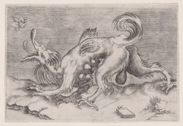 Curator: This engraving, Stefano della Bella’s "Hercules and Deianira," dated 1644, from 'Game of Mythology,' really catches the eye with its dramatic action. What are your initial thoughts on it? Editor: It's definitely dynamic! Hercules is the epitome of muscular tension, Deianira is contorted backwards and about to fall off, and in the background the archer draws his bow! As a drawing, it must have taken so much practice and skill to get these delicate lines and composition, especially back in the 17th century. How do you interpret this work, considering it was part of a "game"? Curator: Exactly! And let's consider how the printmaking process itself shaped the image. Della Bella had to physically manipulate the metal plate to create those fine lines. It suggests a meticulous labor, one readily consumed within the playful context of this game. Note too, how the Baroque aesthetic emphasizes motion and emotion. Where do we locate the social meaning, if it can be consumed like an object for games? Do we think about the printing run in the means of its consumption, or on its artistic value? Editor: That's an interesting question. I suppose, thinking materially, it's both an artistic endeavor and a product, designed to be reproduced and disseminated within a particular social circle playing the game. The cost, accessibility, and durability all come into play. It couldn't just be aesthetically impressive; it also needed to be reproducible at a decent output to justify production of a luxury object. Curator: Precisely. Its value then resided in both its artistic quality *and* its social function. Think, too, about the engraver's own labor. How does this small engraving participate in the larger economics of the time? Editor: So it is all connected – the materials, the technique, the artist's labor, the societal function of art. Fascinating!