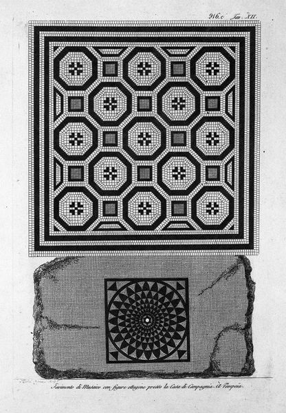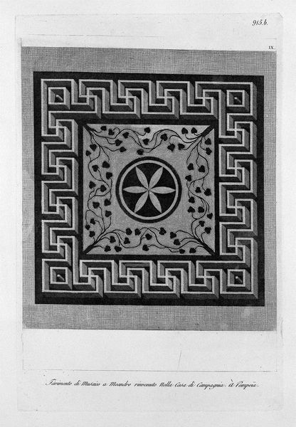 Curator: Looking at this piece by Giovanni Battista Piranesi titled "In the House of Pompeii, once downstairs half-barrel, the ch`ha impostatura for the two longer sides," the precision of line work almost feels unsettling. What do you think? Editor: It does feel rather…clinical. At first glance, I see a meticulously planned space, very formal and structured. The black and white emphasizes the geometric shapes and repeated motifs, creating a sense of austere elegance. It reminds me of blueprints almost! Curator: That's fascinating, because it IS essentially an architectural blueprint, meant to document a space in Pompeii! Piranesi was deeply interested in recording and reimagining Roman antiquity. Editor: So it’s an archeological record, presented as art! The perspective feels odd—as if we are hovering directly above a room's ceiling, or perhaps even a complex mosaic floor. What’s with all the mythological creatures, and why are they flying so furiously?! Curator: Those creatures really give it away that this is no mere objective diagram; they hint at the whimsy that sneaks its way into the architectural plans! The creatures you spotted were a commonly employed motif, decorative elements favored in Roman interior design. This also highlights how influential design was and, in turn, continues to be on visual art. Editor: So this image does not merely capture a style but recreates one, ensuring that it perpetuates across generations of makers and artists. Seeing them depicted here like this makes me realize the importance of ancient Rome. Curator: Exactly! It speaks volumes about the influence these discoveries and artistic traditions have exerted on subsequent eras. Editor: I hadn't thought of it that way initially, but viewing this piece of work has opened my eyes, highlighting Rome's rich influence! Curator: For me too! A visit with Piranesi's print gives new insight to design and creativity.
