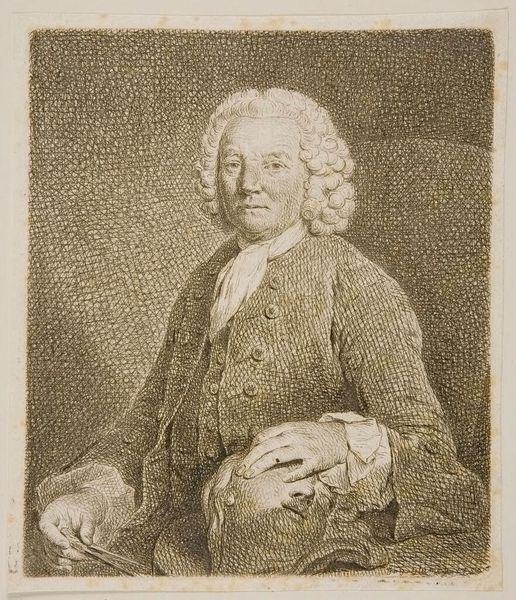 Curator: Up next, we have a charcoal drawing titled “Portrait of a Man in a Tricorn Hat" by Georg Friedrich Schmidt. Editor: My initial feeling is of quiet confidence—or perhaps stubbornness? There’s something very determined in that gaze, yet also a touch world-weary. It's rendered in a warm reddish-brown... sanguine, I suppose you’d call it? It gives the piece an approachable feel, despite the subject’s serious demeanor. Curator: Absolutely. And consider that tricorn hat – a very specific marker of status and period. Beyond just a fashion statement, these hats often denoted military or political affiliation. So, that stubbornness you pick up on? Maybe it’s the steeliness required to navigate those worlds. The softness of the medium somewhat softens the image, however. It lacks the visual punch that darker tones might provide. Editor: I do see how this isn't some austere oil painting shouting about power, but rather a drawing. It's quite intimate. This might be a preparatory sketch, you think? It almost captures the fleeting nature of inner thought. Are we catching him in a private moment of reflection or resolution? And that sanguine tone connects with the flesh; you almost feel his blood pumping beneath his skin. Curator: Possibly. Schmidt was an accomplished engraver as well, so a study like this could definitely inform a more formal work. This piece feels more exploratory. I’m fascinated by how the hatching seems almost frenzied in places, and smooth in others—especially when capturing the volume of that powdered wig! To consider it in terms of activism…perhaps it's important to remember this wasn't just a “look.” A powdered wig, clothing, accessories—they were all ways to visually reinforce a strict social hierarchy, and this portrait situates the sitter squarely within that elite framework. Editor: Precisely! Yet, I also find a challenge to such pronouncements, because you almost feel that the person that is painted in it goes way further beyond just being an echo of what the expectations of status would demand from the sitter. You want to imagine stories of resistance despite everything. Thank you, that perspective enriches this so much. Curator: A fruitful perspective, and food for thought indeed!