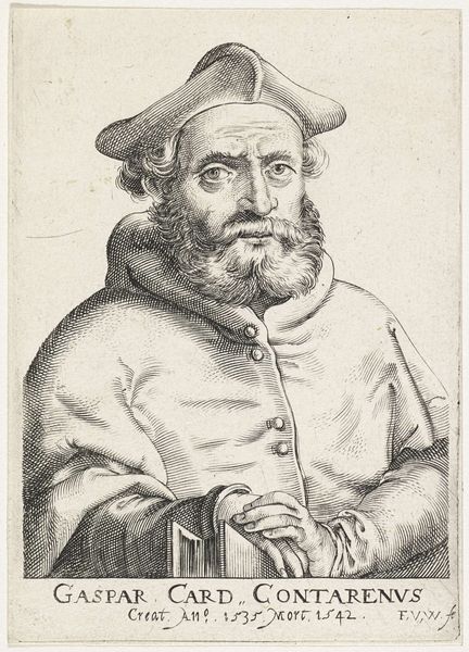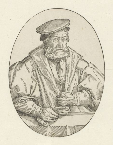 This is a portrait of King John III of Portugal made by Frans Huys, sometime between 1522 and 1562. The print is dominated by the oval frame, encapsulating the king's likeness and power, while the engraving technique lends itself to a play of light and shadow, emphasizing the texture of his garments and the contours of his face. The choice of an oval shape focuses our attention, creating an intimate yet formal viewing experience. The text encircling the portrait acts as both frame and signifier, literally bounding the king within his titles. It is not merely decorative; the careful arrangement suggests a symbolic enclosure, highlighting the divine authority attributed to him. Ultimately, the artwork invites us to consider the relationship between representation and authority, revealing how artistic choices reinforce cultural values and power structures. The portrait is not simply a likeness but a constructed image that negotiates ideas of monarchy, divinity, and the expansionist claims of 16th-century Portugal.