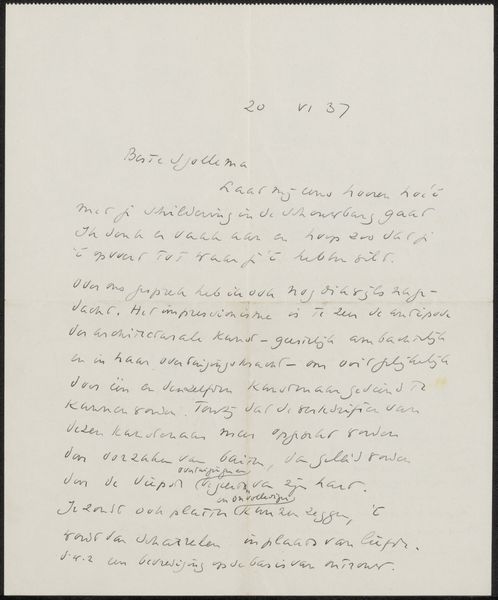 Curator: We're looking at "Brief aan Willem Bogtman" by Richard Nicolaüs Roland Holst, possibly created between 1925 and 1927. It’s currently held at the Rijksmuseum. It consists of ink drawings and photography, combined on paper. Editor: It looks so delicate, almost like an artifact one might discover tucked away in an old book. There's something both personal and formal about the script, creating an intriguing visual texture on the paper. Curator: Absolutely. Holst was deeply involved in the social-democratic movement, and he utilized his art for didactic and political means. Letters were significant ways to maintain close connections among workers, where they could freely exchange their experiences. So, while a letter can be seen as a personal piece, the cultural history surrounding Holst elevates its public role. Editor: That certainly makes me consider the process. The hand-written quality, the permanence of ink... there’s a deliberate, almost crafted element here. Also the photographic interventions break with convention, making it something more than just a functional object for personal communication. I'm wondering about the choices and the labor. Curator: Indeed, the act of selecting a means to deliver his message becomes paramount. How could art facilitate solidarity? Holst taught at the Rijksacademie and his teaching ethos shaped younger artists' understanding of arts’ contribution to political discourse. Editor: To that point, how would you describe this relationship between utility and art here? It straddles being both, perhaps intentionally unsettling traditional hierarchies of "high art" versus functional objects, especially given Holst's political motivations? Curator: Precisely. The letter, in this instance, challenges those boundaries and becomes a unique hybrid, demonstrating how an object can be simultaneously practical, expressive, and socially charged. Editor: I concur. Examining its materials, its creation and intention in communicating socio-political ideas allows a fuller appreciation of this piece, its purpose, and message. Curator: I think understanding how social movements informed artists' approaches to their art really enriches the viewing experience. Editor: Yes, and considering artmaking as an integral part of this kind of exchange brings this letter to life beyond its textual content.