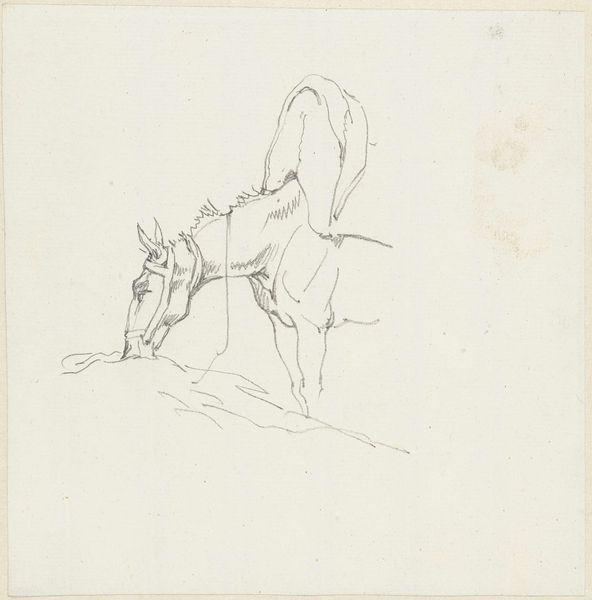 Curator: This quick, understated pencil drawing is entitled "Paartje op een slede," or "Couple on a Sledge," dating from around 1654-1656, by Gerard ter Borch the Younger. It's currently held at the Rijksmuseum. What leaps out at you? Editor: The dreaminess of it! Like a half-remembered fairy tale. The lightness of the pencil work gives it such an ethereal, fleeting quality. It feels so immediate, so intimate—like a stolen glance into someone's personal sketchbook. Curator: Precisely! And Ter Borch was known for these intimate glimpses into Dutch Golden Age life. What I find particularly fascinating is the symbolism embedded in this seemingly simple scene. Editor: Well, the sledge itself certainly carries weight, doesn't it? Beyond its literal function, the sledge could represent the journey of life, perhaps even a courtship, guided by forces beyond the couple's control, represented by the driver or perhaps fate itself. Curator: Good point! And consider the figures. The woman, heavily cloaked, suggests both protection and perhaps concealment. Is she willingly embracing this journey, or is she being taken along? And the man, with his feathered hat and nonchalant pose, appears almost like a carefree navigator. Editor: His hat reminds me of Mercury's helmet – a classical symbol for swiftness, communication, perhaps even trickery? Are we to trust his guidance? This simple sketch opens to so many readings about relationships and destiny. The lightness makes it accessible, but there's a dark undercurrent too. Curator: Absolutely, and consider how prevalent genre painting was during the Dutch Golden Age; artists delighted in subtly encoding commentary within scenes of everyday life. Something as seemingly mundane as a sled ride transforms into a stage for contemplating larger truths. Editor: It reminds us how symbols layer meaning—turning everyday images into portals to deep cultural narratives and psychology. The ghostliness of the line here suggests the fleeting nature of this moment, these relationships and the passing of time and eras. Curator: This has definitely cast the piece in a new, profound light. A testament to how initial simplicity can hold layers upon layers of meaning when seen through the right lens. Editor: Exactly! And a wonderful reminder that every image is a cultural mirror, reflecting back at us our collective stories and beliefs, one ethereal line at a time.