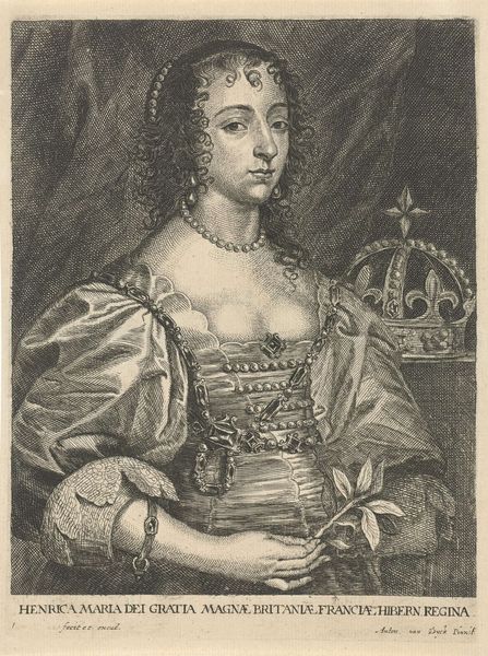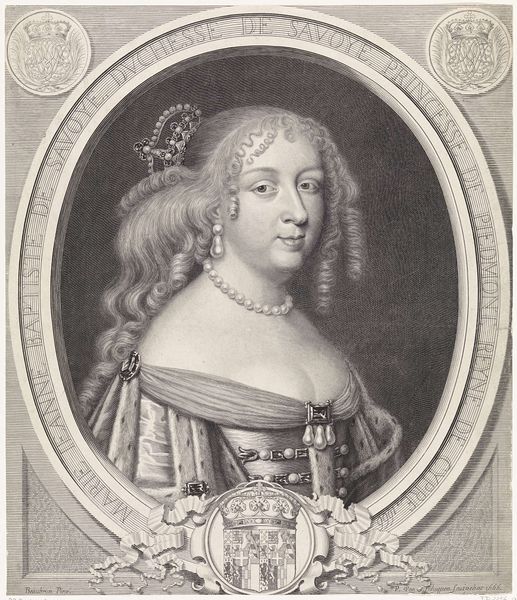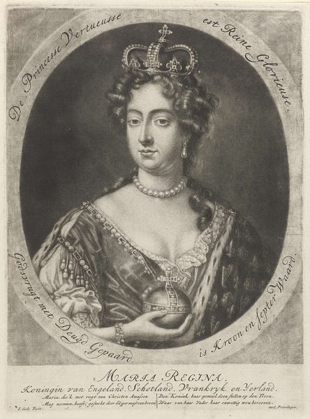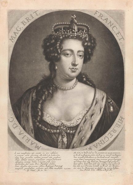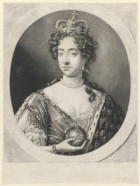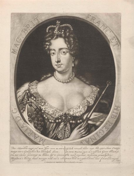 This is an engraving of Queen Mary II of England, an anonymous work now held at the Rijksmuseum. The composition is structured around a central oval containing the Queen's portrait, set against a horizontally lined background that creates a subtle visual tension. The artist employs hatching and cross-hatching to define form and texture, from the intricate curls of Mary’s hair to the regal fur trim. The linear precision used in the crown, the pearl jewelry, and the Queen's dress is contrasted with the softer rendering of her face, creating a focal point that draws the eye. Semiotically, the portrait operates within a rigid framework of royal representation. The symbols of power—crown, jewelry, and clothing—are rendered with meticulous detail, reinforcing the sitter’s status. Yet, the artist's engagement with the medium and the inherent limitations of the engraving process introduce subtle distortions. These formal qualities do not merely depict the Queen, but also negotiate the cultural codes of power, representation, and artistic expression.