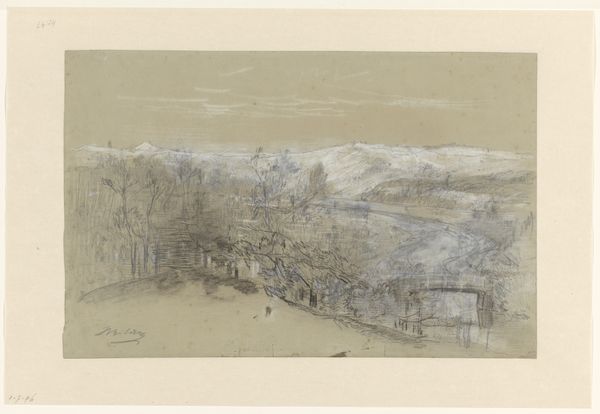 Editor: Ludwig Metz’s graphite drawing, “Near Palermo,” is a landscape view sketched on paper. I find the drawing to be gentle, soft even; a muted exploration of place. What catches your eye in this subtle work? Curator: The fragility, definitely. It feels like catching a fleeting memory before it fades completely. Notice how Metz uses the graphite to create almost a hazy effect. It reminds me of old photographs, slightly out of focus. It also strikes me as very Romantic in the sense of yearning and melancholy, despite being a landscape drawing and seemingly detached observation. Does the composition suggest something about the viewer's relationship to the scene, perhaps a sense of distance or longing? Editor: I think you’re right; the Romantic feel is very strong, there is that yearning for something just out of reach, as suggested by the blurred lines and faded landscape. That far off church or monastery, it adds a real sense of distance. Curator: It also shows Metz’s skillful use of light and shadow to create depth and texture. Can you see how the darker lines in the foreground draw our eyes into the lighter, almost ethereal mountains in the background? He invites us in for contemplation, perhaps. Almost like he whispers, "close your eyes, breathe deeply… what does this scene invoke?" Editor: It’s really amazing how he captures such a detailed scene with seemingly minimal effort. The textures are definitely something that didn't grab me at first, but it makes the drawing far more interesting! Curator: Indeed, Metz captured the subtle allure of Palermo so delicately with this quiet artwork! It’s always rewarding to linger and listen to what an artwork has to whisper to us.