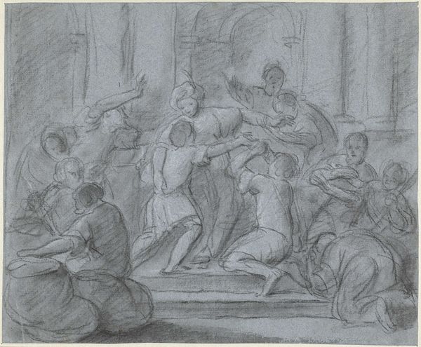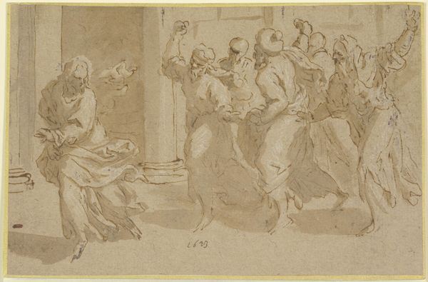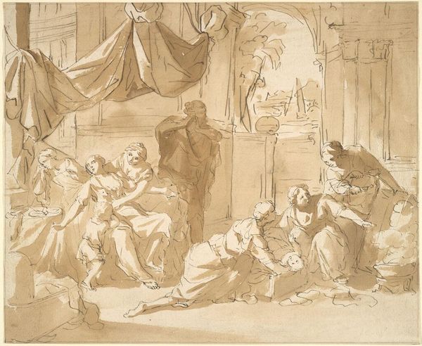 Salomon de Bray’s "Adoration of the Kings," is a drawing created with pen in brown ink and washed on gray paper. The composition is arranged with a central focus on the Virgin Mary and Child, surrounded by the magi and other figures in a tightly packed space. The artist employs a delicate yet confident line, delineating forms and creating a sense of movement within the scene. Bray’s use of wash provides depth and volume, enhancing the emotional tone. The figures, rendered with soft contours and flowing drapery, evoke a sense of reverence and humility, typical of Baroque art. The composition leads the viewer’s eye through a series of gestures and gazes, reflecting a complex interplay of gazes and gestures. De Bray invites us to contemplate not just the religious narrative, but the formal elegance through which it is expressed.