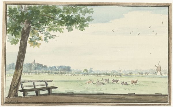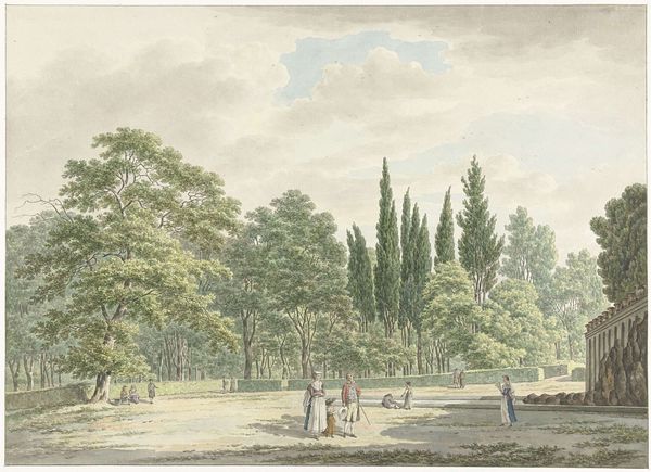 Hermanus Numan created this watercolor painting, "View in the Gardens of the Zandbergen Estate," using watercolor and pencil on paper. Here, the delicate brushstrokes and translucent washes capture the interplay of light and shadow on the leaves and figures. These colors and form of the artwork evoke a sense of leisure and privilege. In this period, watercolor painting was associated with the upper classes and the emerging middle class, as it required leisure time and access to specialized materials like high-quality paper, pigments, and brushes. Notice how the artist depicts the figures in the garden. These are markers of social status. The act of strolling through manicured gardens becomes a display of wealth and taste. By focusing on the material and social context of this watercolor, we can gain a deeper appreciation of its significance. The painting transcends its aesthetic qualities, and becomes a window into the values and social dynamics of the time.