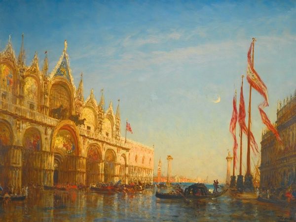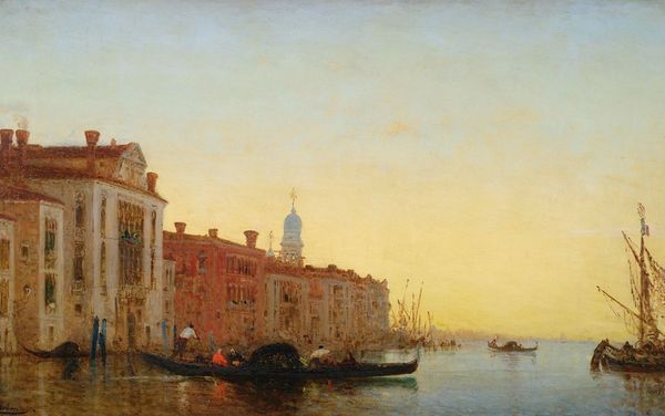 Curator: Oh, isn't this luminous? Like capturing a collective dream. Editor: Indeed. Here we have a painting titled *Gondole Devant Le Grand Bassin, Venise*. We attribute it to Félix Ziem, and it certainly presents a Venetian cityscape, likely rendered en plein-air with oils. Curator: Ziem! What a name! You know, when I look at this, I feel that the colors are alive. Venice, more water than stone—it dissolves reality. Editor: His manipulation of the oils suggests he wanted us to reflect on Venice as a hub of maritime activity—labor in service of a leisured class. The gondola itself, mass-produced despite its appearance, reflects early tourism. Curator: Ah, always looking beneath the shimmer, aren't you? For me, though, it's the emotional shimmer that counts. Look at that moon hanging suspended! It pulls me into the water; I’m on that gondola headed straight for the Doge’s Palace. Editor: Of course. Yet even that palace, the Doge’s Palace, is stone brought to Venice—the building represents human interaction and alteration. Curator: Well, the gondolier—he's real labor in service of an artist capturing beauty! He’s the human heart of the machine of Venice. And the painting—it practically vibrates. Can you feel the evening coolness? Editor: His brushwork feels hurried, efficient. Likely done in a single session or quickly capturing fleeting light; labor within impressionism's time demands to capitalize on the market for these Venetian scenes. Curator: Maybe, but I prefer to think he rushed to capture the soul of Venice—that feeling you get as dusk softens the city. That almost hurts. Editor: It's interesting how, for Ziem and others of the period, Venice was also a place for intense capitalist exchange—tourism in its first full flowering and art created to feed it. The painter himself, the subject, and us now looking. All connected. Curator: Mmm. True or not, I'd row in this painterly sea anytime. Thanks for the counterpoint. Editor: Thank you; understanding the circumstances around making it doesn’t make its beauty any less—if anything, more palpable.