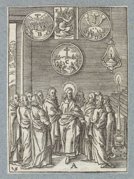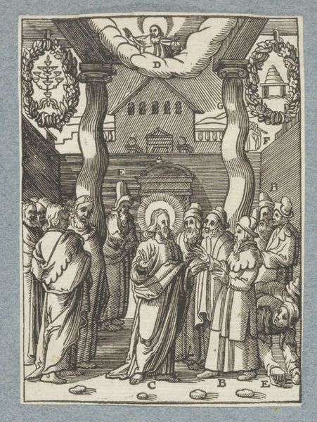 Christoffel van Sichem II created this woodcut, 'Christus in gesprek met de farizeeën en schriftgeleerden,' around the early 17th century. The composition is structured around contrasting architectural spaces. On the left, we see figures gathered within an arched interior, while on the right, others are positioned near a building with a clear view of a seascape. Sichem uses line and form to emphasize the division and interactions between these groups. The lines are precise, creating a dense visual texture that invites close inspection. The contrast between light and shadow, achieved through varied line thickness, adds depth to the scene. This division is not merely spatial; it’s a deliberate construction that directs our gaze and underscores the thematic tension between the figures. The architectural elements aren't just background, they actively frame the scene and enhance the dialogue between the figures. Ultimately, Sichem's formal choices invite us to consider how structures—both architectural and social—shape and mediate human interactions, and how these are visually articulated in the print.
