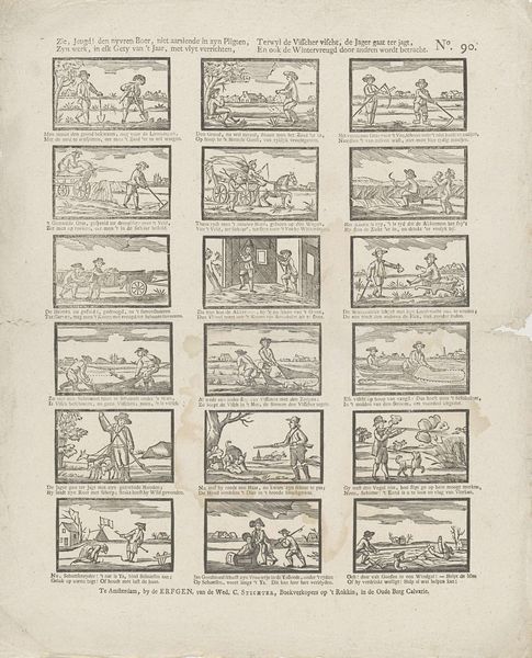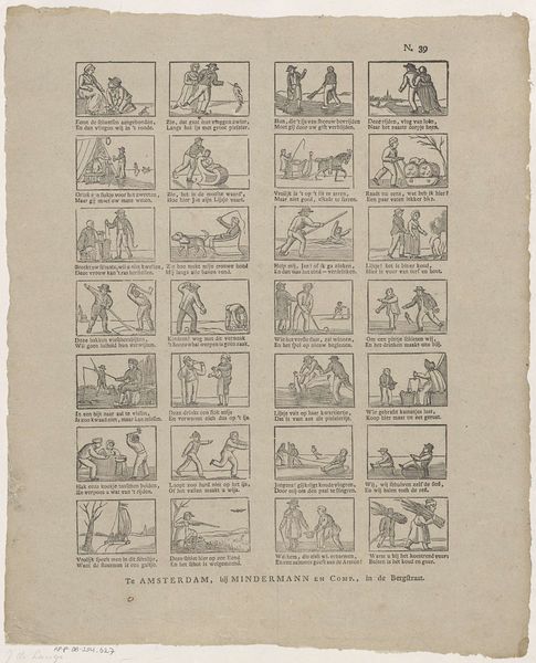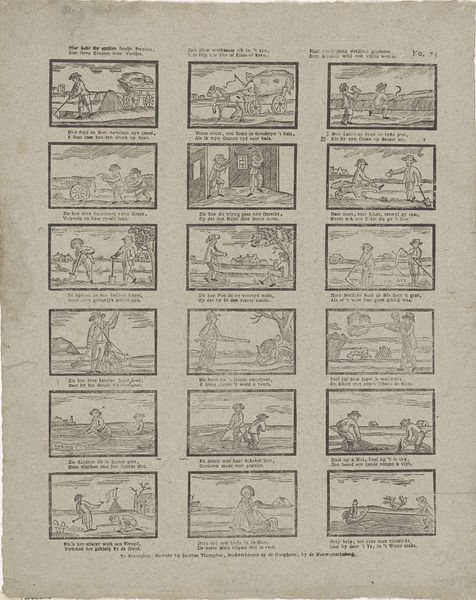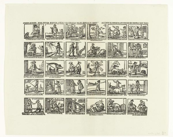 Curator: Welcome to the Rijksmuseum. We are standing before a fascinating etching, dating from 1842 to 1866. It's titled "Hoe bar de winter is, hy geeft nogthans vermaak, Als men maar schyven heeft, dat is de groote zaak" and was produced by weduwe C. Kok-van Kolm. Editor: Immediately, the gridded composition strikes me – it's like a historical comic strip! Each tiny scene unfolds a mini-narrative. It feels folksy, almost like a broadsheet for the masses. Curator: Precisely. The production of such prints served a crucial purpose: mass communication. The lines would have been etched by laborers onto the metal plate, each character and scene requiring manual dexterity. We see a transfer of folk tales, moral stories, and general information meant to circulate widely. The consumption and interpretation are key. Editor: Indeed. Many of the images seem to circle around common proverbs or tales focusing on work and play, or luck in different ways of life. They seem deeply ingrained in the shared experiences and moral codes of the period, so deeply so that their symbolism may not require a ton of textual explanation. The dog appearing pulling along with the figure standing above for instance. How else does cultural context help us decipher them? Curator: Knowing the Dutch socio-economic situation of the mid-19th century provides vital insight. The etching’s use of cheaper materials points to a targeted audience – the common person. Etchings such as this helped popularize genre scenes which traditionally had not been available to those outside of the social elites. Editor: It's wonderful how effectively the artist used accessible imagery to create a kind of narrative poem of everyday life. It makes one wonder, however, if it’s as easy for modern eyes to immediately identify what morals are here. What is being shown here? Curator: Time certainly changes the value associated with specific labor and scenes. Editor: What resonates most profoundly with me is that although the scenes and meanings of them have drifted away over the centuries, we are nonetheless gifted in accessing the continuity that cultural symbols still maintain, though altered slightly. The human experience is remarkably similar! Curator: Exactly, it reflects art's enduring power in how this image was made and shared that keeps it going.