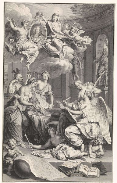 Editor: Here we have Simon Fokke’s 1748 engraving, "Allegorie op het jubileum van Nederlands Vrijheid, 1648-1748," currently at the Rijksmuseum. It's packed with figures, light, and shadow... almost overwhelmingly so. How do you even begin to unpack something this intricate? Curator: I see a dense layering of historical narrative, classism and symbolism all interwoven. The "jubileum" or jubilee celebrated here signifies a specific point in Dutch history. Note how the allegorical figures act as stand-ins for the complex sociopolitical currents of the time. How do the fallen symbols of war on the bottom contrast to the figures in the sky and those in robes behind the woman holding the document? What might those visual juxtapositions tell us? Editor: I guess the fallen arms and broken sculptures at the bottom contrast with the angelic figure up above, and suggest the triumph of peace or maybe prosperity after war. Curator: Exactly! And consider the female figures dominating the center of the piece – the Dutch Virgin. How are women, both as symbols and societal actors, being positioned within this narrative of national identity and liberation? Editor: So it's not just a straightforward celebration of freedom, but also a carefully constructed statement about Dutch identity, using these gendered allegories and symbols of both conflict and harmony. Curator: Precisely. It makes you wonder who this jubilee truly served, and whose stories are being valorized in this representation. Is the image upholding the rights of women and the poor? Where can you draw those conclusions from the symbolism? What can you tell about that hierarchy based on your perception of what is portrayed? Editor: I hadn’t really thought about that. Thanks, it gives me a new way to look at what I thought was a straightforward historical picture. Curator: Indeed, this image, created in a time of emerging capitalism in Europe, calls on the necessity to ask the questions rather than simply admire.