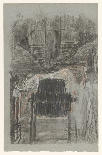 Curator: Here we have "Trein op een viaduct in Londen," or "Train on a Viaduct in London," created by Maurice Blieck between 1886 and 1918. It's rendered in pencil and perhaps watercolor on paper. What strikes you most about it? Editor: The atmospheric quality. It’s a very somber scene – almost a melancholic rendering of the industrial age in London. The heavy, muted colors amplify that. Curator: Absolutely. The strategic deployment of line directs our eye—horizontally, first across the viaduct and then vertically down the structure. The pencil work itself possesses an inherent directness. Editor: Direct, yet not without a certain ambiguity. What interests me most is the visible labor and time it took to realize this depiction. You see the marks, the layers upon layers, hinting at the repetitive and laborious processes characteristic of that time period, mirroring the mechanical processes it depicts. Curator: The formal rigor of its composition cannot be ignored, the bridge forming a clear horizontal axis, anchored by the weight of the building. There's also a visual rhyme in how the light plays with both structures, emphasizing texture. Editor: True, and that texture speaks volumes about the built environment of industrial London. I wonder, what materials were used for the viaduct itself, how the laborers engaged with those materials, and what the environmental impacts were of erecting such infrastructure. Curator: Your focus on the physical prompts further interpretation. The artist’s method echoes and embodies what it represents; a material consequence visualized. Editor: And perhaps prompts reflection about our relationship with those industrialized spaces—the structures that are core to our daily lives but which we rarely consider critically. Curator: I think the stark interplay of light and shadow masterfully highlights the severe geometric qualities, distilling an otherwise commonplace structure. Editor: Indeed, a compelling study of the tangible aspects of city infrastructure and the labor inherent in it. Curator: A potent lens through which we may interrogate urban design. Editor: Leaving one pondering the implications embedded within Blieck's material study.
