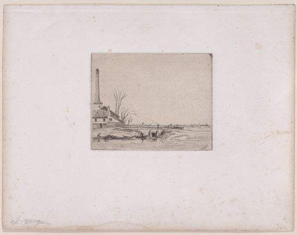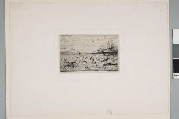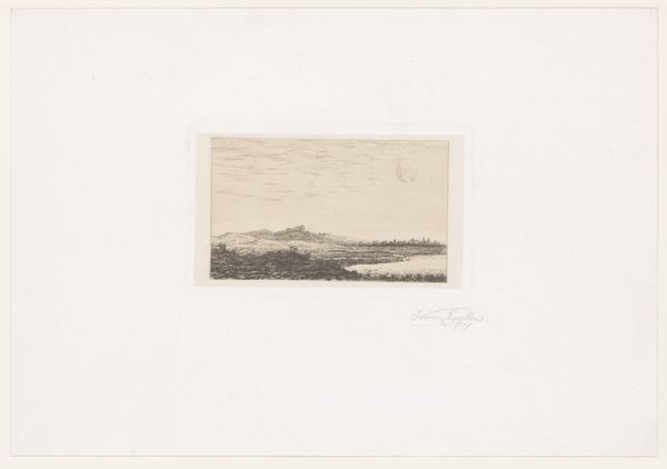 Max Klinger created this etching titled "Homage" around 1881, as part of a series called "A Glove." The print presents a landscape of dreamlike quality. Look at how Klinger uses the stark contrast of light and shadow to sculpt the scene. The focal point, a glove perched atop two poles on a stone, is rendered with meticulous detail against the more ambiguously defined ocean and sky. Notice the waves, stylized into repetitive patterns that create an almost hypnotic rhythm. Klinger's work often explores themes of the subconscious and the symbolic weight of objects. Here, the glove, isolated and elevated, becomes an emblem of fetishism, reflecting late 19th-century anxieties about desire and representation. The formal structure supports this; the glove's prominence challenges conventional perspective, inviting viewers to question established notions of value and meaning. The piece serves as a tableau of psychological complexities, where form and content merge to destabilize the viewer's expectations.