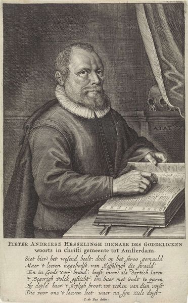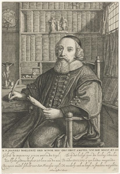Curator: We're looking at a print from the Dutch Golden Age, "Portret van Karel van Mander", created sometime between 1615 and 1680, attributed to Abraham de Cooge. It's an engraving. Editor: It’s incredibly detailed. The way the light and shadow are created using only lines is mesmerizing. I’m struck by how intimate and immediate the subject feels, even though it’s rendered in this old engraving style. Curator: Right. Look closely at the lines themselves, the labor that went into creating this. De Cooge has to meticulously carve each line into the metal plate. It is a reproductive engraving, designed to disseminate Van Mander's image, extending his influence. Note also the inscription below. Editor: True, it is also intriguing that the figure occupies almost the entirety of the frame, really focusing us on Van Mander’s presence and...what's he writing? Curator: Hard to say for sure but the inscription is telling us, "Man seeks much. But one thing is needed." Perhaps it’s a meditation on the writing process, on simplifying complexities to get to the heart of things. Think of the material resources involved—the ink, paper, and the time. Editor: It certainly makes one think about how artistic labour has transformed into the present day with new methods and tools of art-making... But looking back at Van Mander, the face seems to show a blend of seriousness and introspection. And notice the precise details of his attire, it denotes his status and position. Curator: The attire tells us a lot. The ruff, the doublet—these signify wealth and standing. The fact that he's portrayed with writing implements suggests intellect, scholarship, and authority. This piece also plays with ideas around craft and authorship given the added description of who invented it, and who sculpted it. Editor: Absolutely, the composition draws the eye to his hand and the text that follows, underscoring his engagement in this reflective act. A moment frozen for us, carved meticulously, to contemplate art, industry, and society of that period. Curator: It is very beautiful that our encounter with this historical artefact gives pause for reflection about ourselves. Editor: I agree. This piece serves as a reminder of the labour and thought behind every artwork, making us more appreciative of all forms of creative and intellectual output across time and culture.