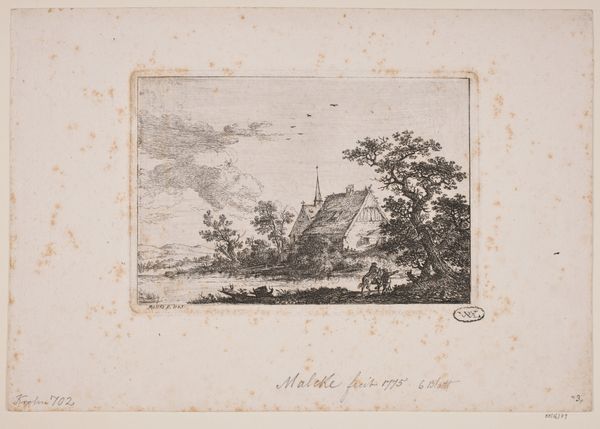 Editor: This is Paul Sandby’s "Benton Castle Looking Down the Reach to Milford Haven," housed here at Harvard. It’s a sepia print, and I’m struck by its stillness. What do you see in this piece? Curator: The sepia ink gives it a nostalgic feel, doesn't it? For me, it's about the picturesque—that 18th-century ideal of landscape. Sandby captures a specific kind of beauty, a controlled wildness if you will. Editor: Controlled wildness... I like that. Curator: It’s a scene carefully composed. The castle, the trees, the boat, all arranged for maximum visual appeal. He’s not just showing us a place; he's crafting an experience, a mood. Editor: It's like he's inviting us into a memory. Curator: Exactly! It makes you wonder about the stories hidden within that view. Editor: I’ll never see landscapes the same way again. Curator: Nor will I!