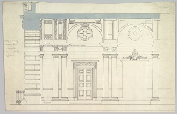 Curator: Welcome. This is a study attributed to Gerrit Boels from 1541. It's titled "Fragment carton for the glass window in the west facade of Joris van Egmond (Bishop of Utrecht 1535-1559) for the Sint Bavo Kerk in Haarlem." The work is executed in ink, watercolor, and drawing on paper. Editor: My immediate impression is that it feels unfinished, yet monumental. The austerity of the lines, those shades of diluted ink creating subtle depths, imbue it with an almost haunting stillness, despite only presenting a small fraction of a larger architectural element. Curator: Indeed. It is just a fragment. What we see here is a preparatory drawing, a "carton" as it was known, for a stained glass window. The subject, Bishop Joris van Egmond, would have been a significant figure in Haarlem’s religious and political landscape. His image, immortalized in glass, reinforced the Church’s authority. Editor: The drawing is quite economical. Boels uses a strict geometry and repetition to render architecture believable to our eyes. There’s also a rather muted palette; a series of grays modulating between black lines. Curator: Exactly! The clean lines emphasize a sense of order during the early Renaissance, when Humanist philosophy led to great developments in architecture and construction, particularly ecclesiastical buildings intended to impress local faithful followers, as well as rival cities, and visitors. It makes me consider just how artworks reinforced hierarchical relations between clergy and their religious constituents in 16th-century society. Editor: Although rudimentary, it does offer an idea about spatial relationships via its linear perspective. You start to see these very controlled progressions that offer visual information about form and recession. It is subtle but efficient. Curator: We see the remnants of religious iconography and the power dynamics of the time made visual. These designs circulated, and these buildings materialized due to vast financial and administrative systems during periods of tremendous political instability. It underscores how much art has to do with things other than artistry. Editor: Right, for me the beauty lies in its restrained and effective translation of three dimensions into two. Curator: Viewing art offers multiple lenses for examination. What moves some is not as interesting for others. Editor: True, yet it is why dialogue around a work enriches our understanding.