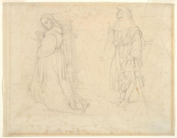 Editor: This is "Two Standing Women," a drawing by Nicolas Lancret, date unknown. The lines are so fluid, and the chalky red just pops against the paper. It feels like a fleeting glimpse, almost as if they're about to walk right off the page! What secrets do you think these ladies are keeping? Curator: Ah, secrets! That's what art is all about, isn't it? Lancret’s capturing a feeling here, that momentary grace of the rococo. Red chalk sings of warmth, of life caught mid-breath. I imagine he's sketching from life, in his studio, light streaming in...almost whispering gossip onto the page. I wonder, do you get a sense of their status or character from their pose and dress? Editor: Well, their dresses are grand, and they have an air of poise...definitely not servants! There's a relaxed elegance about them, almost like they're gossiping about courtly goings-on. Is that why you call it rococo? Curator: Precisely! It’s all about that lightness of being, that frill, that wink! The rococo period revels in capturing that upper crust shimmer, and Lancret’s using the humble red chalk to evoke those silky scenes and playful exchanges, which always feels slightly cheeky! Like the cat that got the canary. It has an elegance of courtly play, doesn’t it? Editor: It really does. I was so focused on the lightness, I hadn’t considered that cheeky side. Thanks! Curator: It's the delicious wink! Though unfinished, each stroke carries that spirit, an invitation into their world. Beautiful, and a real slice of rococo mischief if you ask me.