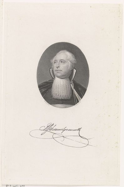 Curator: This is a portrait of Théophile Corret de la Tour d'Auvergne. It's attributed to Nicolas Maurin and believed to have been created sometime between 1825 and 1842. The medium involves engraving and pencil work. Editor: My first thought is the starkness. The monochrome palette, combined with the intense gaze of the subject, creates a sense of stoic determination. Curator: It’s interesting you mention the “intense gaze," because I think Maurin is deliberately presenting La Tour d'Auvergne in a particular light. As a figure celebrated during the French Revolution and later by Napoleon, portraying him with this firmness was politically strategic, solidifying his image as a patriotic hero. Editor: Agreed. Formally speaking, note the expert use of hatching and stippling to model the face and suggest the textures of his coat and powdered wig. The engraver masterfully manipulates light and shadow to convey depth and volume. It gives the portrait a compelling, three-dimensional quality. Curator: Precisely. This echoes the neoclassical ideals popular at the time, aiming for a heroic representation that reinforces the virtues associated with figures like La Tour d'Auvergne. The printing medium would ensure a wider distribution of these ideals. Editor: I'm drawn to the minimal background. The figure commands the viewer's attention, stripped away of any distracting detail. The eye is left to focus on the intricate detail of his face, those details of his clothing, the rendering that tells all the story. Curator: Which ultimately reinforces the notion of La Tour d'Auvergne as a symbol, rather than just an individual. He represents a specific set of values at a crucial juncture in French history, and Maurin's work captures that sentiment for a broader audience. And even today, the echoes are relevant in national identity discourses. Editor: I see how the work achieves this striking visual presence using careful artistic choices in its tonality and detail. It seems to embody both the likeness and the intended ideological reading of a hero of that time. Curator: The portrait becomes more than just an image of a man. It’s a symbol of a movement, an era, and ongoing historical interpretations.