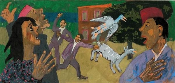 Franz Kline made this oil on canvas painting, Apache Dancer (Bleecker Street Tavern Mural), sometime during his lifetime. Painted during a time of tremendous social change, this work reflects the era's fascination with capturing raw human emotion. The scene presents what appears to be a fraught interaction between a man and a woman in what looks like a public space. The man's dominating posture and the woman's pose of distress hint at themes of power and vulnerability. Are we witnessing a dance, or something more violent? During Kline's time, artists often grappled with depicting the human condition honestly, challenging traditional notions of beauty and decorum. "The final test of a painting, theirs, mine, any," Kline once said, "is: does the painter's emotion come across?" This work pushes us to confront difficult narratives about gender and the dynamics of social exchange. Kline’s piece remains a powerful mirror reflecting society's complex relationship with passion, conflict, and representation. It compels us to consider the stories we tell about ourselves.