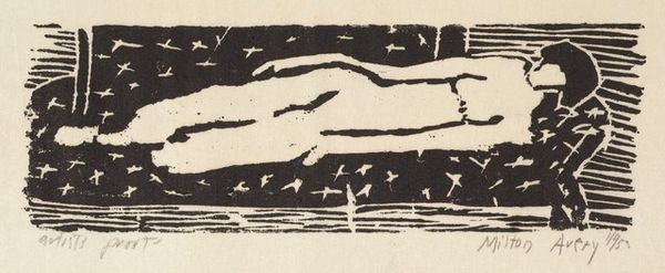 Milton Avery created this woodcut titled "Sailboat" in 1954. It exemplifies his signature style which simplifies natural forms into their essential shapes. Avery’s work, though seemingly apolitical, invites us to consider the artist’s unique perspective in the context of his time. As an American artist working through the mid-20th century, Avery occupied a unique position, navigating the art world's increasing focus on abstraction while maintaining a commitment to figurative representation. His simplified forms can be viewed as a response to the anxieties and uncertainties of the Cold War era, offering a retreat into the serene and uncomplicated. The print isolates the sailboat, inviting a moment of contemplative escape. Avery once said, "Why talk when you can paint?" Through the stark contrast of black and white, Avery captures the quiet beauty of the natural world, offering a moment of respite. The artwork doesn't just depict a scene; it invites us to reflect on the human desire for peace.