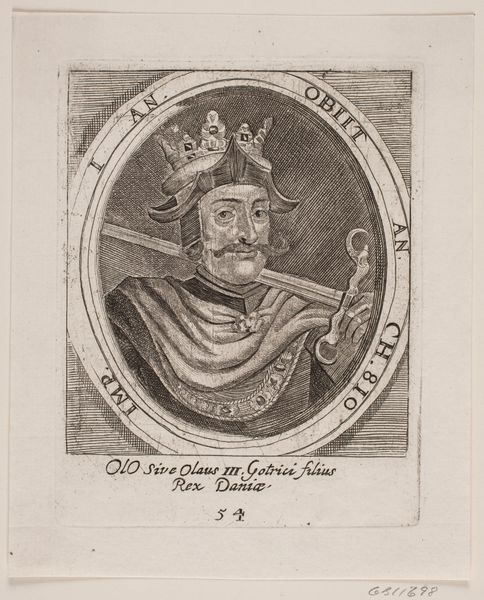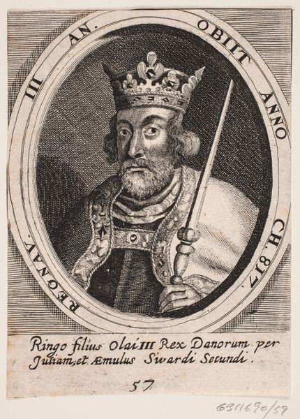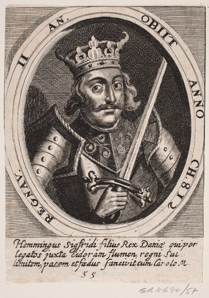 Here we see "Kong Hemming," an engraving of unknown origin held at the SMK. The image presents a portrait of a king encased within an oval frame, a structure that immediately draws our attention to the figure's face and upper body. The artist uses line work to create depth and texture, especially noticeable in the king's armor and facial features. Notice how the lines curve to suggest the roundness of his face, contrasting with the angularity of his sword. The semiotic system at play is rich. The oval frame itself acts as a signifier of importance, encasing the king as a precious artifact. The text surrounding the portrait, though not immediately legible, adds another layer of meaning, evoking historical context and suggesting narratives of power and legacy. Ultimately, this engraving challenges fixed meanings of historical representation, inviting us to consider how formal elements can construct and convey complex cultural narratives. The interplay of line, shape, and textual context encourages a dynamic interpretation, acknowledging the ongoing dialogue between art and its audience.