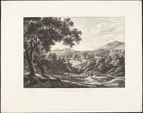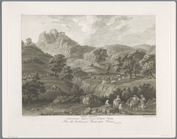 Curator: Looking at "Gezicht op Cantalupo Bardella in Mandela" by Balthasar Anton Dunker, dating from between 1780 and 1805 and held at the Rijksmuseum, I’m immediately struck by how serene the etched landscape feels, like a carefully constructed stage for rural life. Editor: Yes, but staged with such an exacting technique. The tight, controlled lines and meticulous rendering of the landscape read to me not so much as pastoral idealism, but as a kind of documentation of land and labour—particularly given it is etching and engraving combined. We see the land and, simultaneously, the work it asks from the figures present within. Curator: The etching, used alongside engraving, allows for a great range of textures, from the rocky outcrops to the distant mountains. But I am not convinced that the work of the figures is presented so overtly. Dunker organizes the planes, the distribution of dark and light to direct our view to the vista—more picturesque than critical, perhaps. What do you think the decision to include these figures in the foreground signals to viewers of that era? Editor: The foreground's activity contrasts sharply with the receding, monumental landscape. Think about the economy of the print medium itself, the copper plates carefully worked. The means of production highlight this connection. The choice to place laborers so distinctly into the scene does point to the backbreaking demands levied on ordinary people within these locales. What's crucial here, then, is less whether Dunker sought to explicitly critique conditions, but the conditions made materially evident. Curator: It's a delicate balance, isn’t it? While your reading opens the landscape to consider the impact of the mode of production, it also is hard to escape the sense of harmony and idealization in this artwork, especially since landscapes during that time, often borrowed visual vocabularies and symbols that appealed to aesthetic ideals or the sublime, right? Editor: Certainly! A complex interaction happens, though: through those labor-intensive print processes, Dunker isn't just offering an uncritical perspective of sublime harmony. Dunker acknowledges, maybe unknowingly, the structures upholding idealized visions. Even by visually contrasting the grandeur with workers shown alongside animals and materials scattered across the ground in the front—the division of labour made visibly and inescapably plain. Curator: It's a fascinating lens through which to reconsider the artwork’s historical importance and aesthetic dimensions together. Editor: Exactly, examining the materials, labor, and production unveils those tensions within an outwardly peaceful vista.