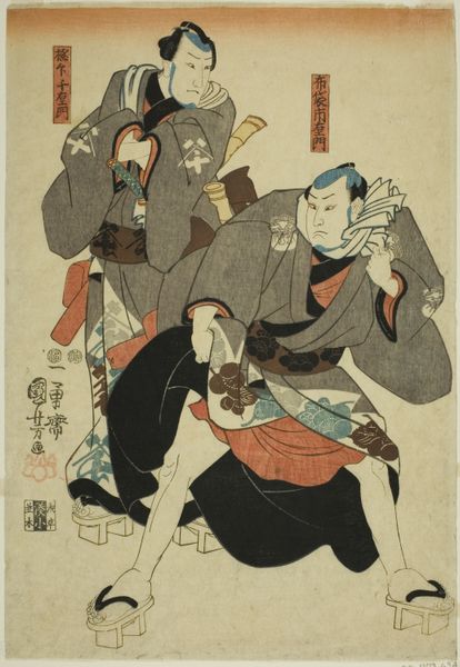 Editor: This print, simply titled "Print", by Utagawa Kuniyoshi, was created sometime between 1800 and 1861. It's currently at the Metropolitan Museum of Art. There's something quite graphic and cartoon-like about it; I wonder what the story is? What can you tell me about this piece? Curator: Let's start with the materiality of the piece. This is a woodblock print, a process integral to understanding its creation. Consider the labor involved – the carving of the blocks, the application of pigments, the printing process itself. This wasn't about individual genius; it was about skilled craftspeople, working within a specific social and economic system of production. How does understanding it was a woodblock print inform our understanding? Editor: I guess it highlights that artmaking at the time wasn't always a solitary artist creating something from scratch, but a team of people contributing their skills... sort of a mass-produced art. Curator: Precisely. And consider who these prints were made *for*. Not necessarily the elite, but a broader audience, part of a rising urban culture in Japan. Look at the colours and design – intended for popular consumption. It’s not just ‘art’ in the fine art sense, it’s a commodity. And the swords… those imply status, but what's really going on with them, would you say? Editor: They seem miniaturized? As though they're not real swords? Curator: Maybe pointing to their commercial distribution within the popular classes? Think about what materials were used, and how those materials connect to global trade routes and patterns of consumption. It's a small print, yet connected to a much larger world. Editor: So it’s less about the figures depicted, and more about how the print itself was made and consumed. Curator: Exactly! It forces us to move beyond just aesthetics, considering labour, economy, and social context. It is all deeply intertwined. Editor: That's really shifted my perspective. I was initially just seeing a picture, now I'm thinking about the whole production process. Thanks!