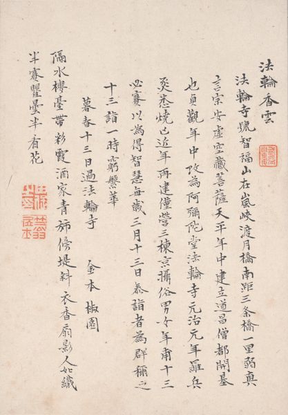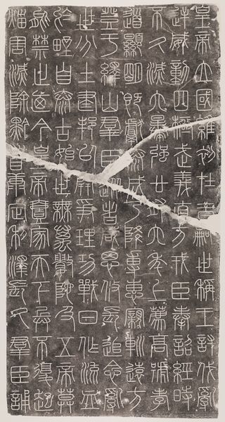 Curator: Let's discuss "Grave Inscription" by Murase Taiitsu, created around 1881. It’s a hanging scroll, rendered in ink on paper. Editor: Initially, I am struck by its texture, and the labor implied in the work; the rubbing reveals every imperfection. It communicates loss and memory through the act of its creation, a physical trace of inscription and transfer. Curator: I concur; there’s an interesting tension between ephemerality and permanence in the stark contrast of the black ink against the paper. The artist skillfully employs varied stroke weights and spacing. Consider the placement of each character within the whole. The formal elements convey an almost architectural solidity. Editor: Yes, and what was the method in reproducing the calligraphy? You have the texture from rubbing, but what does that imply about access, and making something public? Given the tomb inscription source and nature of epigraphy, I immediately think of labor; someone created the inscription, then this print captures the texture of it. The process of creating the rubbing itself embodies ritual. It’s not simply about transferring an image; it’s about active engagement and documentation. Curator: Precisely! Semiotically, the calligraphy itself presents a codified system. Notice the composition and flow of each character, directing the viewer's gaze downward, almost leading to contemplation and quiet reflection. This piece operates beyond mere communication. Editor: Right, this speaks volumes about not just high art, but about craftsmanship as memorial. The means of production really tie the creation of the image and what it stands for; as material gradually disappearing into a printed form. This isn't simply a picture, it's the creation of memory. Curator: I see it too; together these aesthetic choices produce a somber yet reverential tone. Thank you, this has certainly given me another way of looking at this artifact. Editor: It highlights art making that brings together labor, time, and materiality as central to an experience that touches history itself.