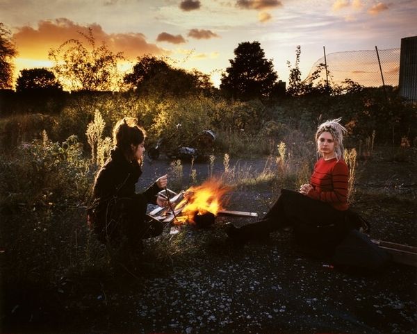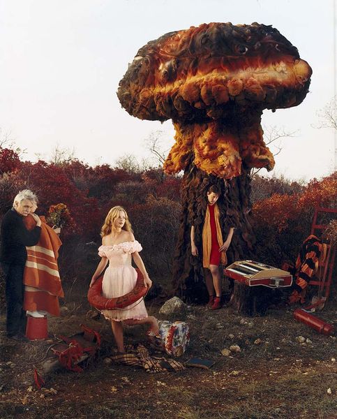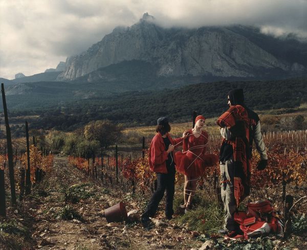 Curator: Arsen Savadov's 2002 photograph, "Last Project," immediately presents such a curious arrangement of elements. I'm particularly interested in discussing its possible social critique. Editor: My first impression is a haunting stillness, a tableau vivant set against a somewhat faded landscape. The almost theatrical red dresses of the figures really pop against the landscape. Curator: Absolutely. And notice the landscape, though, isn't it interesting? It seems a derelict vineyard becomes an active participant within this highly arranged composition, offering, I think, a sharp comment on the changing economies. Editor: The vineyard certainly feels past its prime, which resonates strongly with the inclusion of the skeleton scarecrow; its television antennae implying obsolescence. The image feels rich with symbols of time passing and culture decaying. Curator: Indeed. The entire construction, including the tire and bucket strewn nearby, speak volumes about repurposing the discarded elements into art—emphasizing their material histories in a Postmodern style. Savadov is actively shifting the focus to what society values, discards, and even commodifies through art making. Editor: And what of the figures themselves? The children in life preservers are almost like modern Ophelias; youthful innocence surrounded by a strange kind of death and decay. The red attire—are we meant to see a reference to Soviet aesthetics here too? Curator: Possibly. The photograph definitely invokes the tension of tradition clashing with a somewhat surreal industrial reality, pushing the medium's capacity to represent both material concerns and imagined states. Editor: It's a striking synthesis. The layers of symbolic meanings and materials almost build up like a collage – compelling us to piece together its complex narrative. Curator: Ultimately, I feel the image’s strength rests in how its composition refuses to reconcile art-making and consumption—almost like an unanswered query. Editor: A thought provoking final project, indeed, that is full of material metaphors. Thank you for drawing our attention to the significance of decay as well as visual symbols!