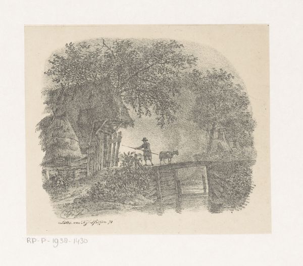 Hendrik Marcus Schouten made this print, "Ruiter met hond bij een brug," using etching, a form of printmaking. In etching, the artist covers a metal plate with a waxy, acid-resistant ground. They then draw through this ground with a sharp needle, exposing the metal. When the plate is dipped in acid, the exposed lines are "bitten," creating grooves. Schouten then inked the plate, wiping away the excess, so ink remained only in the etched lines. Pressing paper against the plate transfers the image. The resulting print has a distinctive, slightly raised texture. The etched lines capture a fleeting scene of rural life. The choice of etching, with its capacity for fine detail, reflects a desire to elevate everyday subjects to the realm of art. By understanding the labor-intensive process of etching, we appreciate the skill and time invested in this seemingly simple image. It blurs boundaries between craft and fine art, inviting us to value both the image and the making behind it.