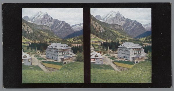 Curator: Before us, we have Hans Hildenbrand's "Gezicht op de Rosengarten, gezien vanaf Klobenstein," likely created before 1908. It appears to be a gelatin silver print, potentially enhanced with some mixed media techniques. Editor: Immediately, I’m struck by the scene's quiet desolation, and the stark contrast of textures, with snow dominating the foreground. What visual story does it attempt to tell? Curator: Landscapes of this kind often carry a deep connection to the Heimat, a German concept of homeland. Note how the Rosengarten mountain range is prominently featured, like an immutable feature. There’s a reverence in this view, which transcends simple documentation. Editor: The composition really highlights the Romantic tradition, placing humankind against the sublimity of nature. The presence of footsteps could imply the journey, maybe even pilgrimage. I wonder, however, if this idealized representation elides the socio-economic realities of early 20th-century rural life? Curator: Perhaps. Yet, that foreground offers us an entry point. I believe the addition of watercolor or colored pencil softens the starkness of the photograph, turning this into something more akin to a memory, idealized perhaps, but emotionally charged. Editor: I see your point, and there is something undoubtedly appealing. Though, I think the enhancement lends the landscape an almost unsettling artificiality. Are we meant to believe in its reality, or acknowledge its constructed nature? Curator: The beauty in it lies, precisely, in that tension. In folklore, the Rosengarten is associated with King Laurin's rose garden. Could this "enhanced" photograph speak to cultural myths? Do we glimpse a hidden or transformed world, existing just beyond the threshold of the ordinary? Editor: Certainly, invoking myth brings a complex layer to the interpretation. It opens us to questions about who the land truly belongs to and about stewardship itself. Ultimately, an unsettling quiet beauty emerges. Curator: Indeed, it makes one reflect on both individual and collective memory within landscapes of significance. Editor: Right. A potent combination, urging viewers to question both their perspective and the tales these serene scenes can carry.