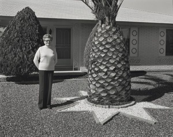 Allen Dutton made this gelatin silver print, "9425 Arrowhead Drive." The composition is striking; a monumental palm tree dominates the foreground, its textured trunk leading the eye upwards. The monochrome palette emphasizes tonal contrasts. The stark sunlight casts sharp radial shadows on the gravel, creating dynamic lines that intersect with the domestic scene behind. This photograph is a study in structure, line and form. Dutton uses the palm tree as a framing device, juxtaposing the natural, organic texture of its trunk against the geometric order of the suburban house. The shadows are like graphic vectors, disrupting the static nature of the architectural backdrop. Dutton subtly challenges our notions of the everyday. The interplay between light and shadow, the contrast between organic and geometric forms, encourages us to look beyond the surface and to decode the underlying semiotics of the suburban landscape. Is this a critical commentary? Or a pure observation of form? Dutton leaves us to decide.