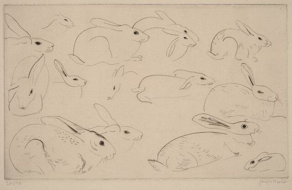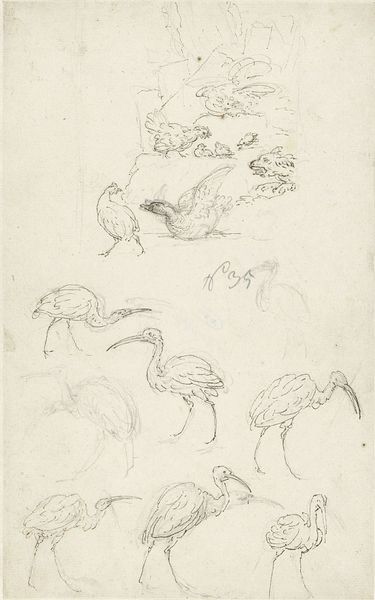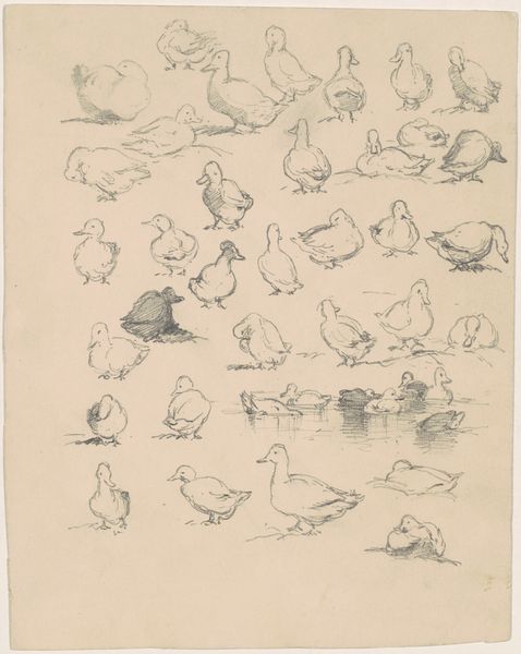 Editor: This drawing, titled *Studies of Ducks*, is by William Valentine Schevill. The medium appears to be graphite on paper, and it depicts numerous ducks in different poses. What do you see in this piece? Curator: I see a poignant commentary on the commodification of nature. The repetitive study of ducks, devoid of a natural setting, reduces them to mere objects of observation and potential resources, echoing the historical exploitation of animals within capitalist systems. Editor: Exploitation? Curator: Yes, consider how these 'studies' might inform hunting practices, domestication, or even symbolic representations reinforcing human dominance. It’s a subtle critique embedded within a seemingly innocuous sketch. What do you think? Editor: I hadn't considered the political dimensions before, but now I see how even a simple sketch can reflect complex power dynamics. Curator: Exactly. Art often subtly mirrors and critiques prevailing societal norms.