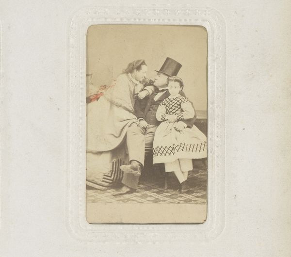 Curator: This arresting photograph by Ramòn Buch y Buet, simply titled "Portret van twee vrouwen," and thought to have been created between 1866 and 1895, really evokes the spirit of its era through the detailed depiction of the two women. Editor: The first thing that strikes me is the somber mood. Despite the intricate lace and ornamentation, their faces seem etched with a weariness, almost a sense of resignation. There's an intensity to their stillness. Curator: Note how the light catches the textures of their dresses, contrasting the smoothness of the backdrop with the patterned floor. This play of textures gives depth and presence to the photographic print. Structurally, it’s about verticality meeting soft, curving edges, no? Editor: Absolutely, yet how does this aesthetic composition interact with societal constraints of the period? The women are positioned close together, almost touching, within what looks like an interior space that subtly acknowledges the limitations and expectations placed upon women during the late 19th century. Does the photograph attempt to liberate or reinforce prevailing ideas? Curator: I see your point, the domestic sphere as a signifier of their circumscribed existence, though look closer, the controlled gradation of light seems equally interested in surface and its very subtle variances. Doesn’t that point to the image’s formal ambitions? Editor: But we cannot detach the gaze from the sitter, and from there consider the sitter from their historical realities. Does it mean something, for instance, that these women are captured together? Could their relationship signify emotional solidarity, defiance or simple friendship amidst strict social roles? These visual texts become so much richer when seen through lenses of gender, identity, and resistance. Curator: A compelling argument. The convergence of such disparate ideas underscores the artwork's complexity. Perhaps its visual appeal belies layers of unspoken stories about their era. Editor: Perhaps, and in these complexities is precisely where we glimpse these women as whole, three-dimensional beings negotiating lived realities behind every hem, pleat, and gaze.