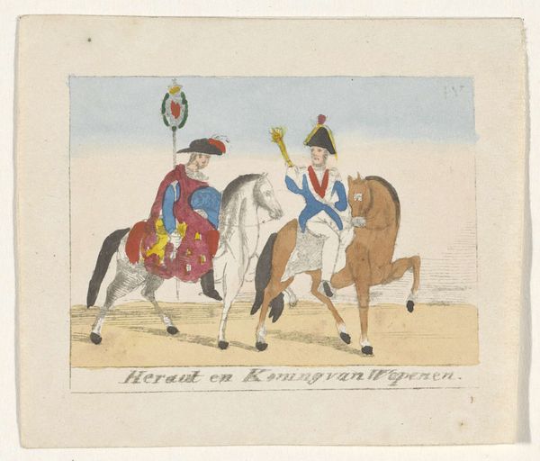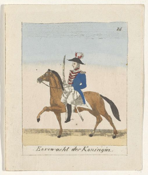 This drawing of a major of the Civic Guard in Amsterdam was made in 1787 by an anonymous artist, using watercolor on paper. The translucent quality of watercolor allows for delicate layering and blending of colors, visible in the depiction of the horse’s coat and the major's uniform. It's a technique that demands precision and control, reflecting the discipline of the subject matter. The artist likely used fine brushes to achieve the details in the tassels and trimmings, each requiring careful application of pigment. The choice of watercolor, a medium often associated with preparatory sketches and illustrations, imbues the artwork with a sense of immediacy and accessibility, in contrast to the grandeur typically associated with military portraiture. The level of detail and care suggests a commitment to craft, aligning with the Civic Guard’s ethos of civic duty and skillful execution. By focusing on the materials and processes involved, we gain a deeper appreciation for the subtle nuances of this artwork, challenging traditional distinctions between artistic skill and civic representation.