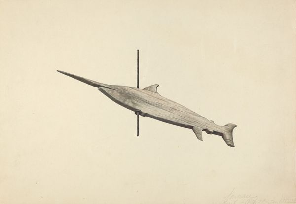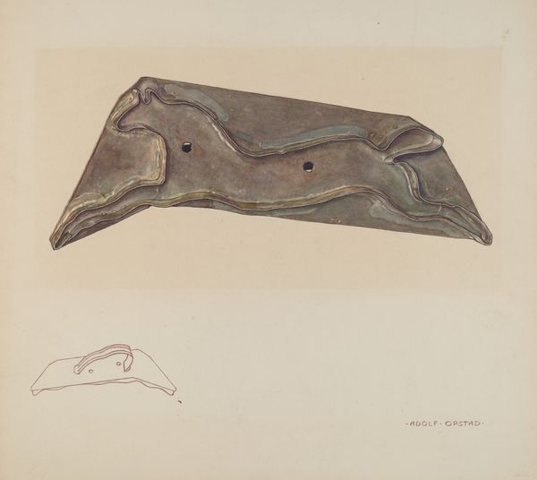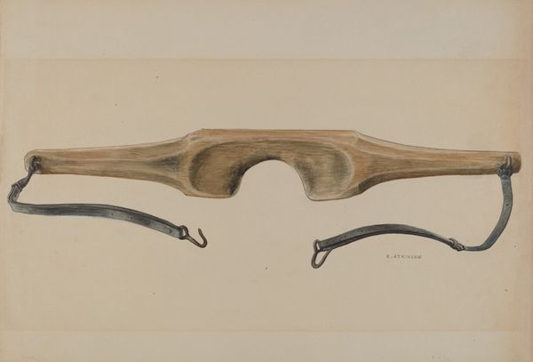 Curator: Alexander Anderson created this work, "Bootjack," around 1942, using watercolor and drawing techniques. What catches your eye initially about this piece? Editor: Well, it’s funny; I immediately thought of Pinocchio’s nose! There’s something so simple yet suggestive about its form, this humble piece of wood transformed into art. I find myself wanting to touch it, feel the worn grain. It has this almost haunting stillness, don’t you think? Curator: Yes, the simplicity invites closer inspection. A bootjack is an object of utility, meant for removing boots—yet Anderson elevates it, making it the sole focus. There's an intersection of class, labor, and rural life happening. During the 1940s, art shifted with the rise of Modernism, but some artists, like Anderson, preserved representational work celebrating Americana. How does that resonate with you, knowing its cultural context? Editor: It does change my perspective, grounding my initial whimsy in a specific time and place. It’s interesting how a utilitarian object like this evokes so much, and its unassuming nature allows my imagination to project stories onto it. Curator: Absolutely, it invites us to reconsider the art inherent in the everyday. Think about who owned it, who made it, who it served. Anderson, by highlighting this single object, prompts a reflection on broader questions of value, and social standing, really. How does that relate to art of our time? Editor: Oh, massively! I think art now wrestles with those same questions, that constant renegotiation between beauty, usefulness, and the human narrative. We assign value to anything and everything—sometimes without even thinking. I appreciate how this piece reminds me to consider what gets overlooked. And maybe to tug harder when my boots get stuck… Just kidding! Mostly. Curator: So, as we leave this piece, perhaps we can reflect on the stories behind the objects that fill our lives. Editor: Absolutely! I will definitely look at my own bootjack (metaphorical, of course; I am terrible with cowboy boots), with a newfound appreciation. Maybe it has stories of its own to whisper…