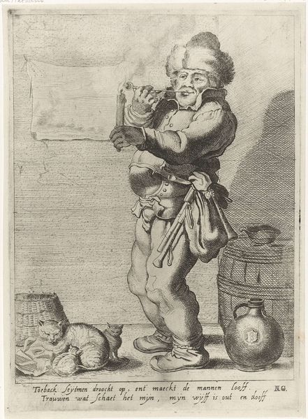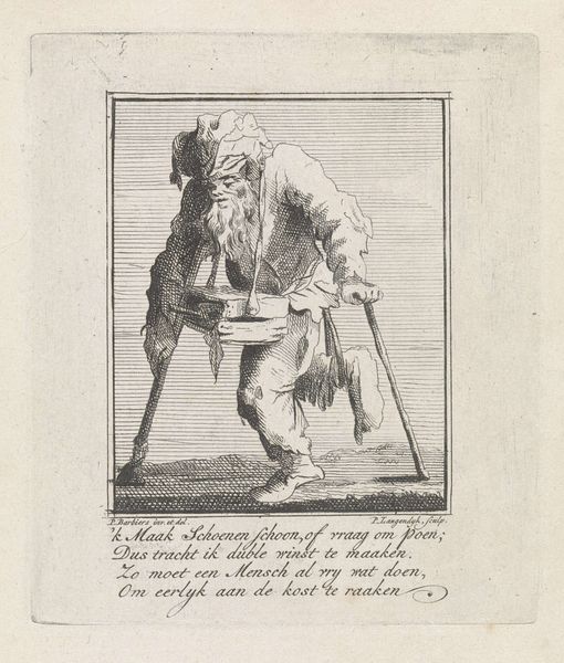 Curator: I find myself drawn to the almost Dickensian character etched into this engraving. Cornelis Saftleven created this print, "Manke Man," sometime between 1645 and 1706. It really throws you into another world, doesn't it? Editor: It does. My first thought? Tragic clown meets street philosopher. There's something undeniably theatrical about him, yet shadowed by what seems to be misfortune and marginality. Curator: Indeed! Saftleven, known for his genre scenes and narrative art, captures the Baroque era's fascination with both the grotesque and the everyday. The engraving medium really lends itself to highlighting texture and character, wouldn't you agree? Editor: Absolutely. That hat practically screams 'texture'. Look closer at that script he's holding too – what an interesting symbol, perhaps an ironic declaration by someone who seemingly relies on the kindness of strangers. Are we seeing, in his vulnerability, a comment about perception itself? Curator: Good eye! That paper may well hold verses. Crippled though he is, holding up verses relates to that sense of "being seen" even at his state. And what to make of the crutch strapped to what looks like his bare leg! Saftleven leaves it up to us to invent the "whys" behind him being an unfortunate. Editor: The strap reads to me as ingenuity – or, to put it more darkly, an unwillingness to truly seek aid. To think he fashions his own strange, uncomfortable solution... which speaks volumes. The details of Baroque genre paintings never stop offering new thoughts on humanity and culture. Curator: And so many readings layered within the character—perhaps he is an exile of his society? I love these intimate portrayals that pull us so deeply into personal and symbolic imaginaries. Editor: Me too! I'm still chewing on the strangeness and drama he suggests through such a modest print.