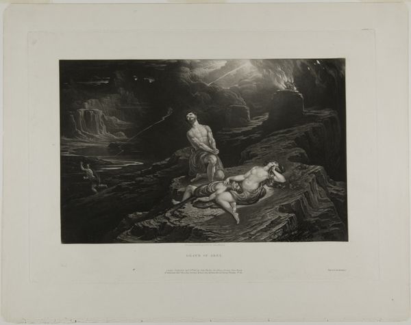 Curator: Right, so this is "The Expulsion, from Illustrations of the Bible" by John Martin, created around 1831. It's a print, engraving and pencil drawing on paper. My first impression? Despair made visible. Editor: You know, looking at the tonality, it’s predominantly a somber grayscale. The lines seem etched with… resignation. There’s an incredible weight, not just of atmosphere, but of consequence. It feels heavy, almost… apocalyptic. Curator: It's definitely playing on those dramatic, Romantic themes of the time. Think about the Industrial Revolution – huge social upheavals, a sense of loss. This echoes that profound displacement on a mythic scale, right? Driven from paradise into… what? Editor: Exactly! It makes me consider the physicality of the work itself. Printmaking allowed for the mass dissemination of images; what were the means of producing that emotional impact, and what did it mean for an increasingly literate population? Were they purchasing this image and processing this moment with awe and the potential horrors awaiting? Curator: The scale of the landscape overwhelms Adam and Eve, really driving home their insignificance. That cavernous space, with its threatening, looming forms, mirrors their internal landscape of guilt and vulnerability. Editor: See how Adam is guiding her – maybe even pushing or dragging her slightly. Their collaboration of the sin of eating the apple now fractures as they enter an adversarial position for survival, driven by material needs now instead of divine guidance. What raw materials, exactly, would they have available? Curator: It really highlights the before-and-after nature of their transgression, doesn’t it? A poignant reflection of how things can irrevocably change, a point of no return. Editor: For me, the appeal isn't so much in the sentimental Romantic landscape but more the sheer volume of distribution and its relation to their material lives being forever changed. What does owning a depiction of your ultimate sin or loss mean? What is this consumption achieving? Curator: A dark memento? A permanent symbol, and now an industry and memento…of how simple materials like pencil, paper, and engraving tools reflect some profound shift? Quite something to chew on. Editor: A way for us to look closer at ourselves and at what is gained or lost in the transition from the past towards some uncertain future indeed.