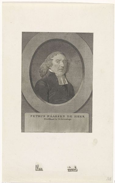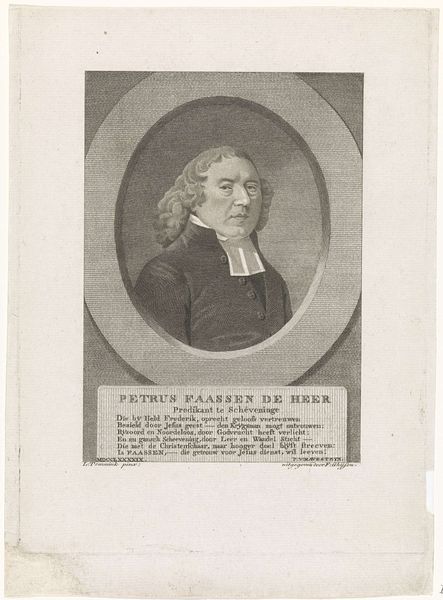 Editor: This is a rather formal portrait, an engraving from 1807 by Johannes Christiaan Bendorp, titled "Portret van predikant Adrianus Mandt." The sitter's got a stern look. The oval frame and the inscription below give it a very official feel. What do you see in this piece? Curator: I see the rise of a particular kind of civic identity being promoted. This portrait of Adrianus Mandt, a preacher, wasn’t just about representing him as an individual. It’s about conveying authority and respectability within a very specific societal framework. The framing, the clear inscription, all of it contributes to how the public *should* perceive figures of authority. Notice how the poem elevates the sitter beyond earthly bounds. Editor: So it’s less about him, and more about his role? Curator: Precisely! Consider the Neoclassical influence, suggesting order and reason—the visual language speaks to values that the burgeoning middle class would want to project and promote in their society. What are the implications, in your opinion, of showcasing ministers in such a formal and almost imposing way? Editor: Hmm, I guess it creates distance. Making him more of an ideal, perhaps less approachable as a real person? Curator: Exactly! These public images controlled the narrative, solidifying power structures within the church and, by extension, society. These printed portraits distributed authority but also became subject to debate about who deserved to be seen in this manner. Editor: I never considered how much a simple portrait could reveal about power and societal values. Thanks! Curator: My pleasure. It's fascinating how images become entangled with, and actively shape, historical narratives.